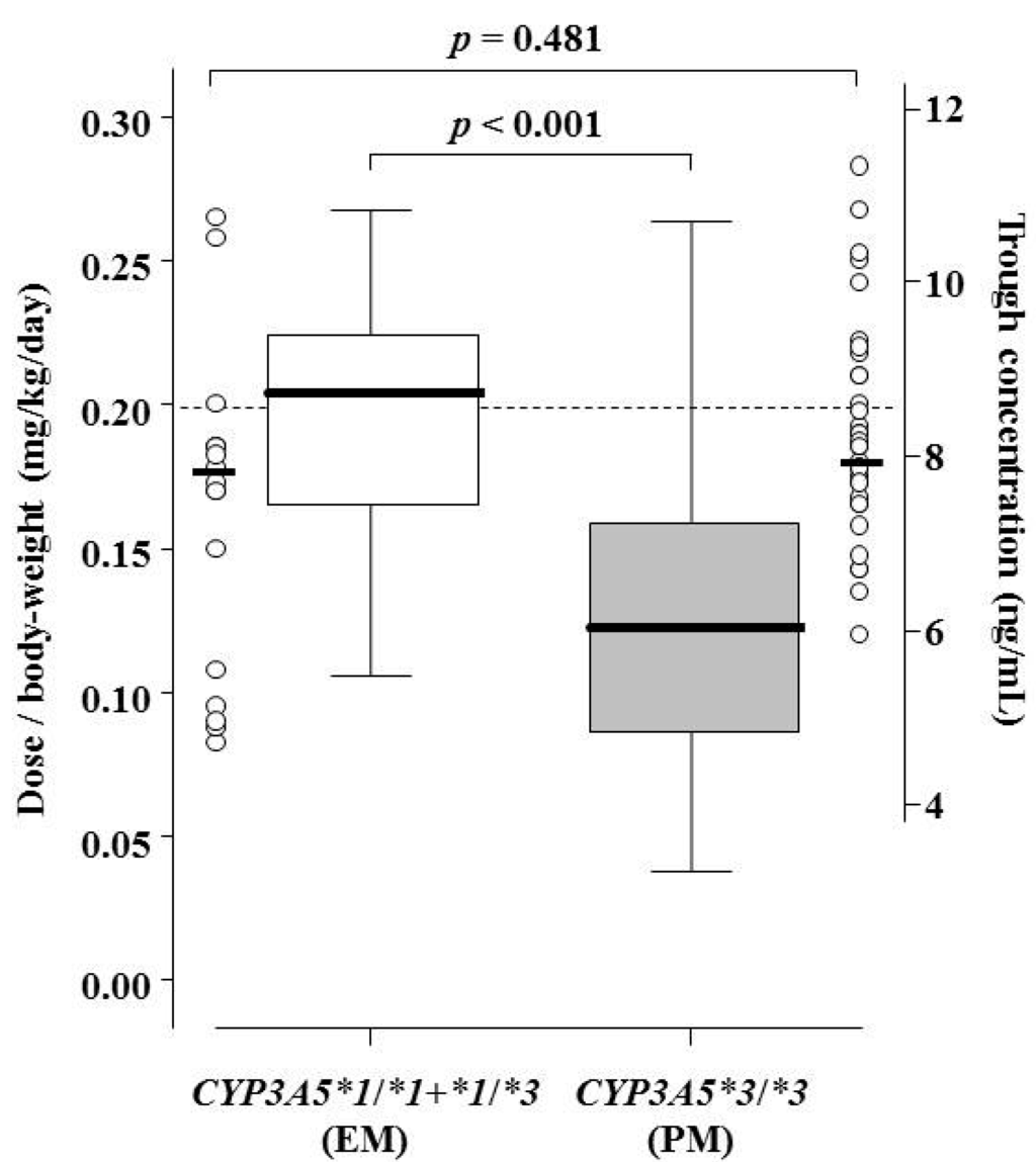 The body weight-adjusted tacrolimus dose on Day 28 was approximately two-fold higher for CYP3A5 EM than CYP3A5 PM patients (0.21 (0.17–0.22) vs. 0.13 (0.09–0.16) mg/kg/day, p < 0.001), although there was no difference in C0h at the same time (Figure 4).