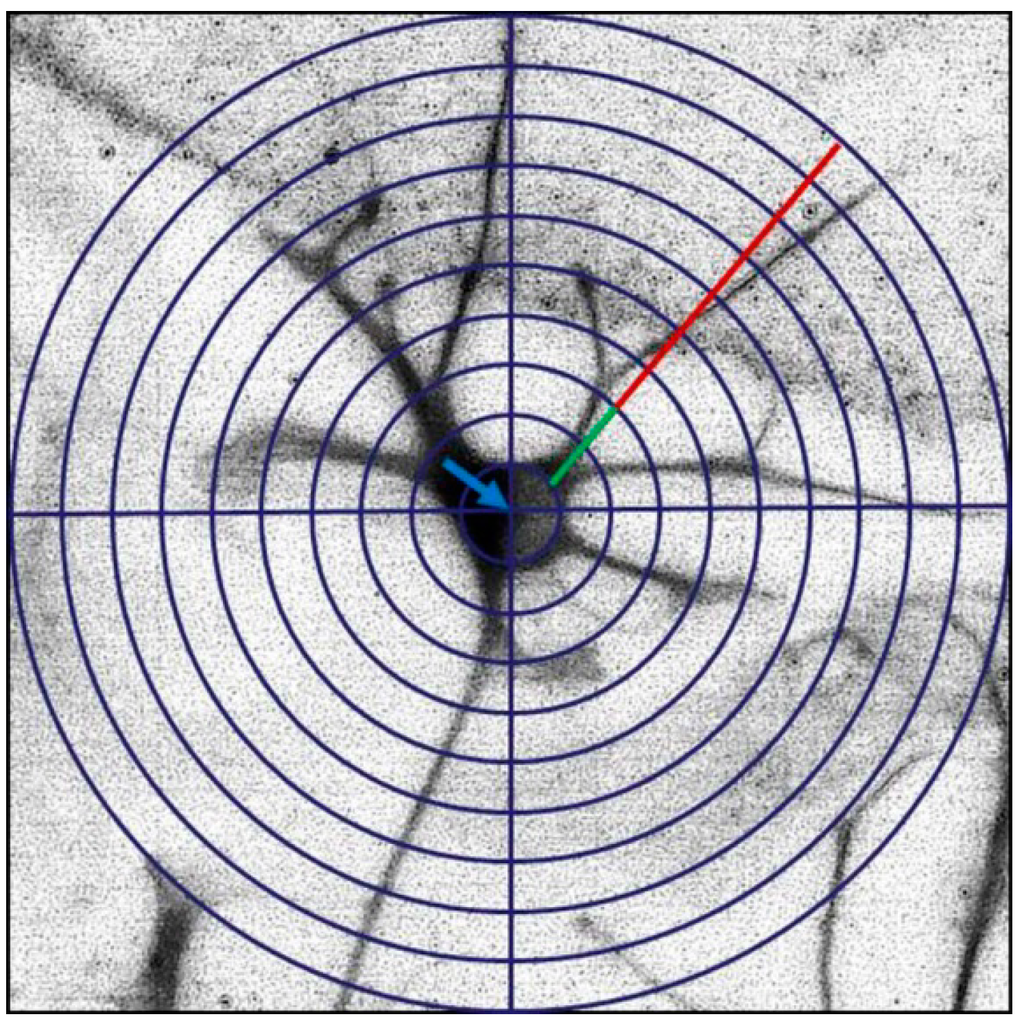 Schematic drawing of the modified Sholl method to determine the number and length of primary and secondary dendrites. A grid of concentric circles equidistantly drawn five micrometers apart was superimposed at the center of the neuronal soma (blue arrow). Dendrite formation was determined by counting the number of emerging dendrites from the soma. Primary dendrite length was measured from the soma up to the first intersection (green line). Complexity of dendrites was determined by counting the number of secondary dendrites as well as by measuring their length (red line).