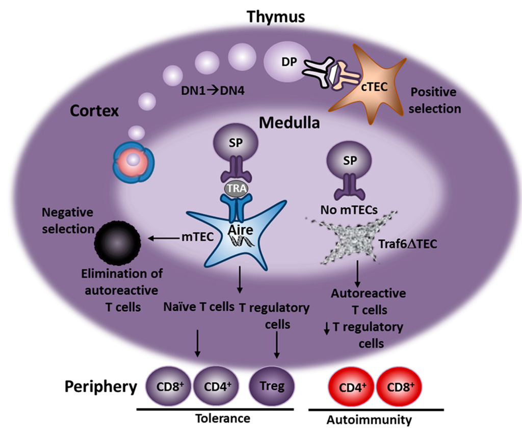 Schematic representation of T-cell selection and tolerance induction in the thymus. Bone marrow progenitors enter the thymus at the corticomedullary junction (CMJ) and migrate towards the cortex, where they differentiate into immature thymocytes lacking expression of the CD4 and CD8 coreceptors (double-negative 1-4, DN1-4). Upregulation of CD4 and CD8 gives rise to CD4+CD8+ double-positive (DP) thymocytes whose T-cell receptor binds to self-antigens presented by cortical thymic epithelial cells (cTEC). A fraction of DP thymocytes are positively selected and differentiate into CD4+ or CD8+single-positive (SP) T-cells. These migrate to the medulla, where they bind to tissue-restricted antigens (TRA) presented by medullary TECs (mTEC) and whose expression is regulated by Aire [30,31]. Autoreactive T-cells that bind to TRAs with high affinity are negatively selected. SP T-cells with weak affinity for TRAs are allowed to exit the thymus, whereas T-cells with intermediate affinity for TRAs become regulatory T-cells (Treg). mTEC depletion in Traf6∆TEC mice leads to the production of autoreactive T-cells, impaired production of Tregs and peripheral autoimmunity.