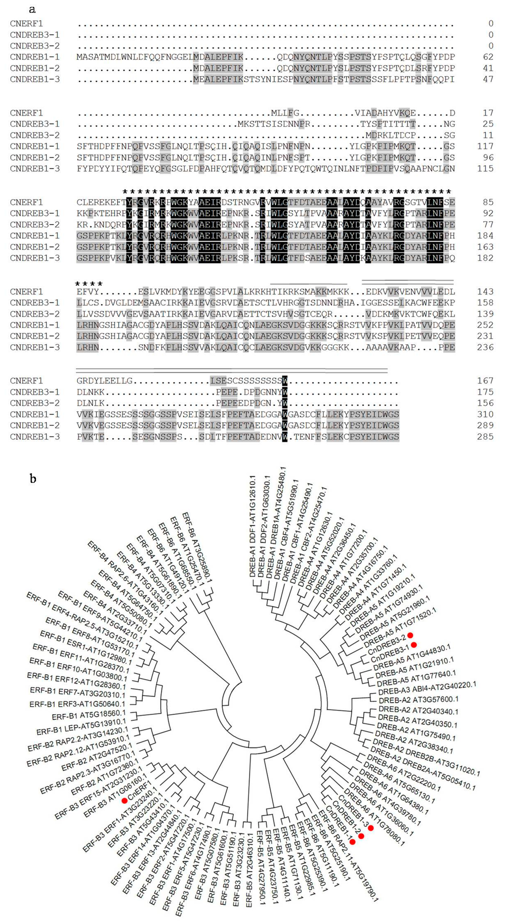 Deduced peptide sequences of the CnAP2/ERF transcription factor (TF) products and their phylogenetic relationship with A. thaliana homologs. (a) The deduced polypeptide sequences; residues shared by at least three of the six sequences are shown shaded, whereas those conserved across all six polypeptides are marked in dark grey. Asterisks indicate the conserved DNA-binding AP2/ERF domain, a double overline indicates the putative acidic domain and a black underline indicates the putative nuclear localization signal; (b) Phylogeny of the CnAP2/ERF TF products. Dots indicate likely homologs.