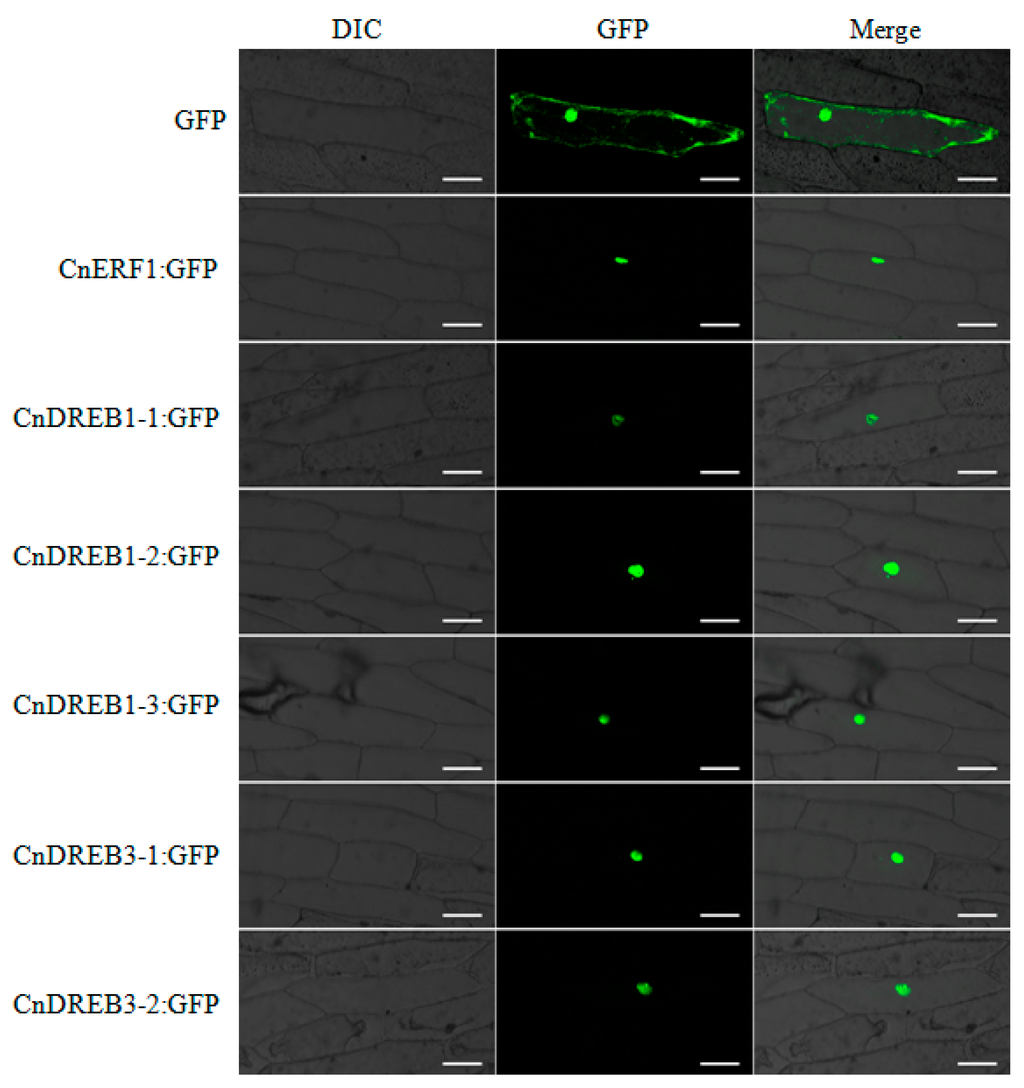 Localization of transiently expressed CnAP2/ERF TF products in onion epidermal cells. The upper row shows the control 35S::GFP signal, and each of the lower rows the signal from one of the 35S::CnAP2/ERF-GFP transgenes. The left panel shows bright field images, the middle one green fluorescence signals detected at 488 nm and the right one the merged Green Fluorescent Protein (GFP) and bright field images. Bar: 50 μm.