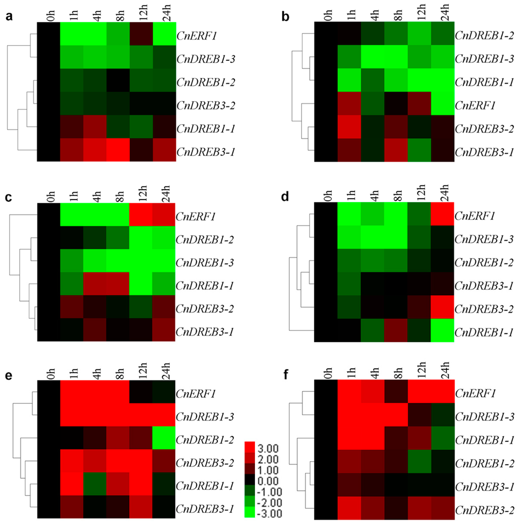 Transcript abundance of CnDREB1-1 was raised by salinity stress, peaking 4 h after the stress was imposed, whereas CnDREB3-1 was up-regulated throughout the salinity stress episode, peaking at 8 h. The other four TFs were down-regulated to differing degrees; thus CnDREB1-3 was down-regulated throughout, while the abundance of CnERF1, CnDREB1-2 and 3-2 transcript recovered to the background level after some time (Figure 4a). CnDREB3-1 and 3-2 were substantially up-regulated after a 1 and 8 h exposure to ABA, but CnDREB1-1, 1-2 and 1-3 were down-regulated throughout the treatment, and CnERF1 was only marginally induced at 1 and 12 h (Figure 4b). The effect of SA treatment was to initially induce CnDREB3-1 and 3-2 transcription, but the transcript abundance then declined, only to increase again by 24 h. CnDREB1-2 and 1-3 were both strongly down-regulated, while CnDREB1-1 was induced initially and CnERF1 at a somewhat later time (Figure 4c). When subjected to JA treatment, the transcription of both CnDREB3-1 and 3-2 was largely unaffected, that of CnERF1 was increased at the end of the period and the other three TFs were all repressed to differing extents (Figure 4d). The low temperature stress induced CnDREB1-3 and 3-2 throughout the treatment, while it caused an oscillation in the transcription of CnDREB1-1 and 3-1. CnERF1 was up-regulated within the first 8 h, but later was suppressed, and CnDREB1-2 behaved similarly (Figure 4e). Wounding increased the transcript abundance of all six TFs initially, with CnDREB1-1 and 1-3 peaking at 4 h, CnERF1 and CnDREB3-2 still substantially showing up-regulation at 24 h, and CnDREB1-3, 1-1, 1-2 and 3-1 being variously suppressed towards the end of the stress episode (Figure 4f). All obtained data were displayed in Table S1.