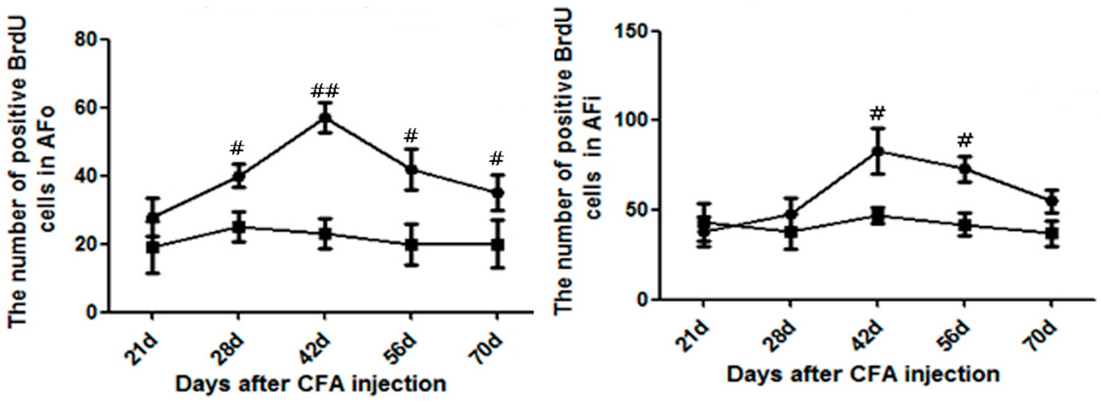 2.4. Running Exercise Might Attenuate Bilateral Mechanical Allodynia by Increasing Cell Densities