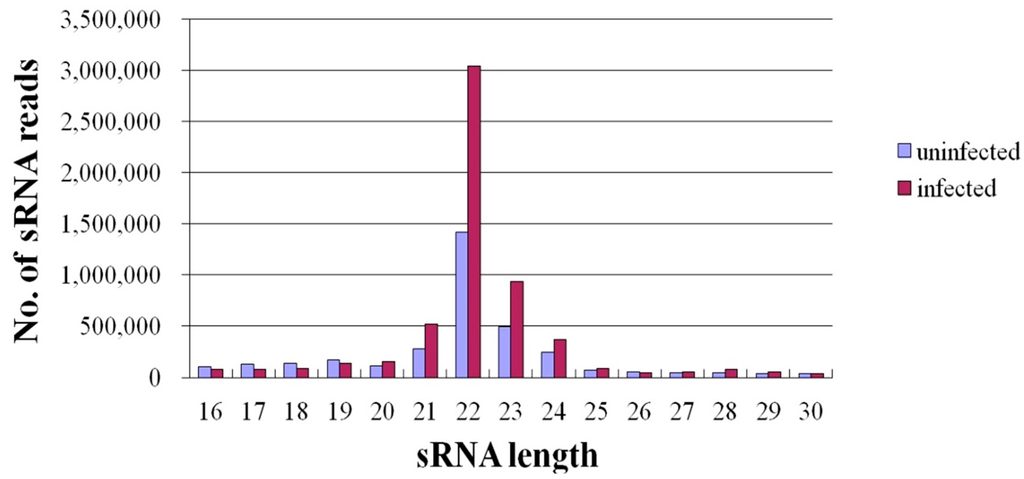 In recent years, deep sequencing has become a powerful strategy for identifying novel miRNAs that cannot to be identified with microarrays and studying the expression profiles of miRNA in different species at various developmental stages, in normal and diseased states, etc. [19,20]. After JEV follows its natural route of infection via JEV-carrying mosquitoes, the virus first multiplies in skin epithelial cells and lymph nodes, infects peripheral organs, such as kidney, liver and spleen, and then invades the subsequent transient viremia, after which the neurotropic virus spreads to the CNS [21]. PK-15 cells, a porcine kidney epithelial cell line, have a similar function and susceptibility as skin epithelial cells. In addition, numerous studies on JEV have been conducted in PK-15 cells [22,23,24]. Therefore, PK-15 cells are a good model in which to evaluate the role of cellular miRNAs in the host response to JEV infection. To investigate the effects of JEV infection on miRNA expression, two small-RNA libraries from infected and uninfected PK-15 cells were constructed and sequenced with deep sequencing (Solexa/Illumina) technology. In total, 6,290,138 and 3,987,148 filtered high-quality reads were obtained from the infected and uninfected libraries, respectively. Reads with copy numbers of ≤2 and that were shorter than 15 bases after the adapters were trimmed were deleted. The total numbers of clean reads obtained from each library were then 5,926,967 and 3,562,868, respectively. The size distributions of the small RNAs were similar in the infected and uninfected libraries. Most of the small RNAs (67.86%–82.11%) from both libraries were 21–24 nt in length, and 22-nt RNAs were the most abundant, accounting for 51.27% and 39.69% of the small RNAs in the infected and uninfected libraries, respectively (Figure 1). This is consistent with the typical size of miRNA from Dicer-derived products, and our results suggest that the libraries were highly enriched in miRNA sequences. We also excluded certain known types of RNA sequences, including mRNA, rRNA, tRNA, snRNA, snoRNA and repetitive sequence elements. Ultimately, 5,106,674 and 2,876,659 clean reads remained from the infected and uninfected libraries, respectively, and were used for the miRNA analysis.