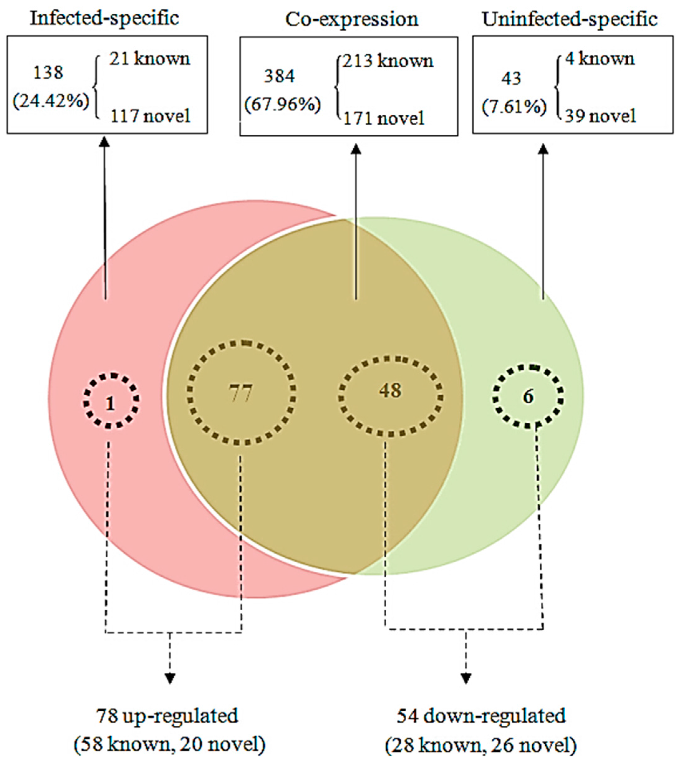 Comparison of differentially-expressed miRNAs between the JEV-infected and -uninfected cells. The Venn diagram displays the distribution of 565 unique miRNAs across the infected group and uninfected group. The dashed circles indicate the miRNAs that were significantly differentially expressed in the infected group relative to the uninfected group.