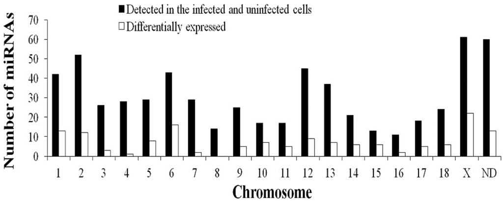 Chromosomal locations of miRNAs based on the numbers of total miRNAs (detected in the infected and uninfected cells) and differentially-expressed miRNAs. “ND” means that the genome location of the pre-miRNA has not been determined.