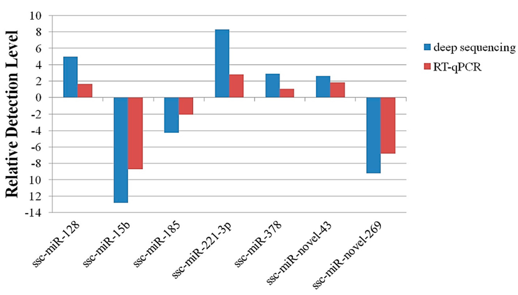RT-qPCR was used to confirm the sequencing data. Seven candidate miRNAs were randomly selected: two novel miRNAs (ssc-miR-novel-43 and ssc-miR-novel-269) and five known miRNAs (ssc-miR-128, ssc-miR-15b, ssc-miR-185, ssc-miR-221-3p and ssc-mir-378). The miRNA primers are shown in Table 2. The expression levels of the miRNAs determined with deep sequencing and RT-qPCR were compared (Figure 4). On the whole, the relative expression levels of the selected miRNAs detected with RT-qPCR were lower than the relative expression levels determined with deep sequencing. The difference may explain the difference in the sensitivity of the two methods.