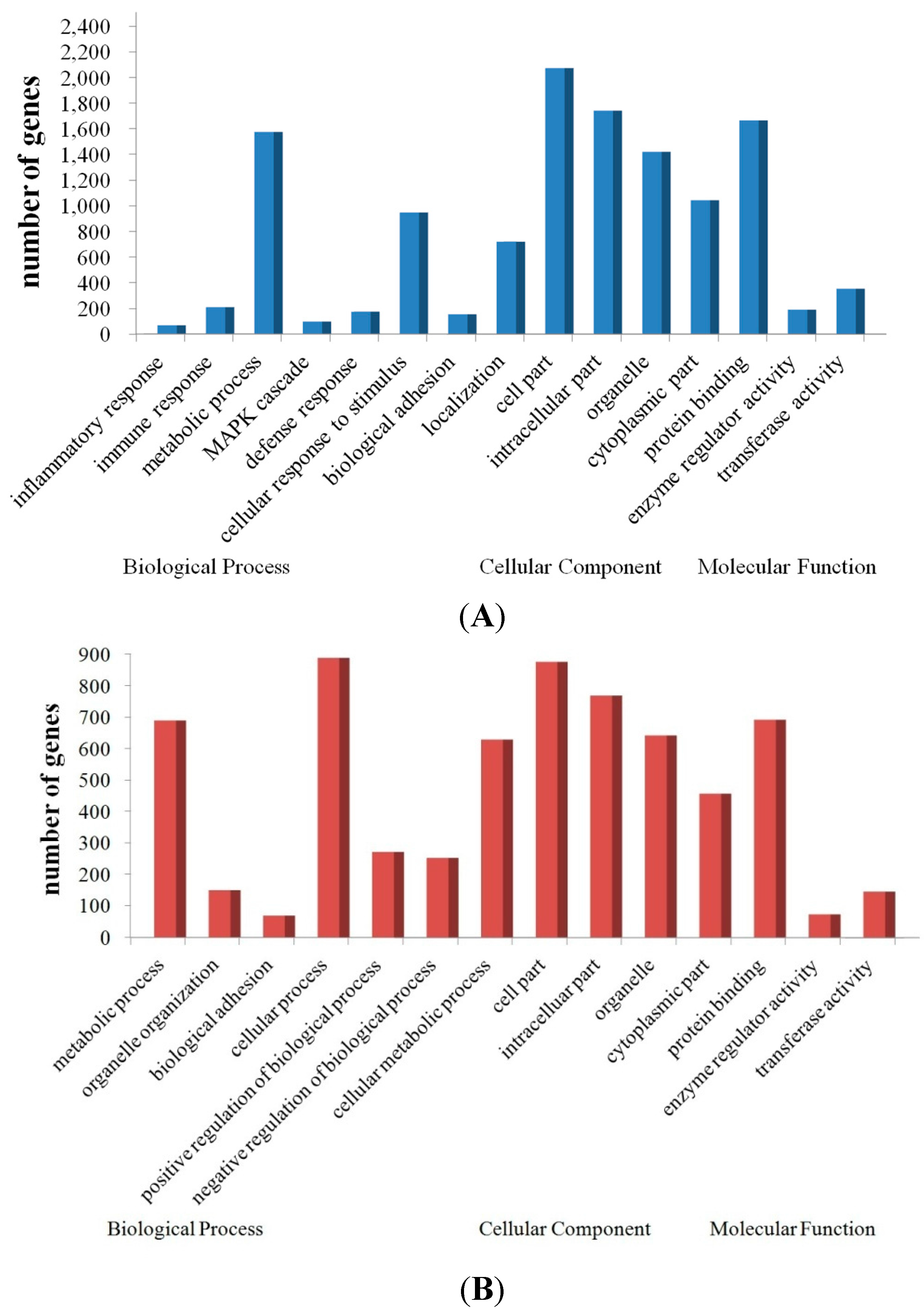 To further our understanding of the physiological functions of the dysregulated miRNAs in response to JEV infection, the potential targets of the up- and down-regulated miRNAs were predicted with two commonly-used miRNA target prediction software programs: TargetScan and miRanda. We found tens of thousands of putative targets in the combined outputs of both programs. All of the predicted target genes of the up- and down-regulated miRNAs were then subjected separately to GO analysis. More upregulated genes (targets of the downregulated miRNAs) than downregulated genes (targets of the upregulated miRNAs) were successfully annotated with the GO analysis. The GO category analysis revealed that the upregulated genes fell into the following categories: inflammatory response, immune response, defense response and stimulus response. The main GO categories for the downregulated genes were cellular process, metabolic process and regulation of biological process (Figure 5). Activation of these biological processes (especially related to inflammatory and immune response) suggests a strong antiviral response of the host, but may also contribute to JEV pathogenesis, resulting in encephalitis.