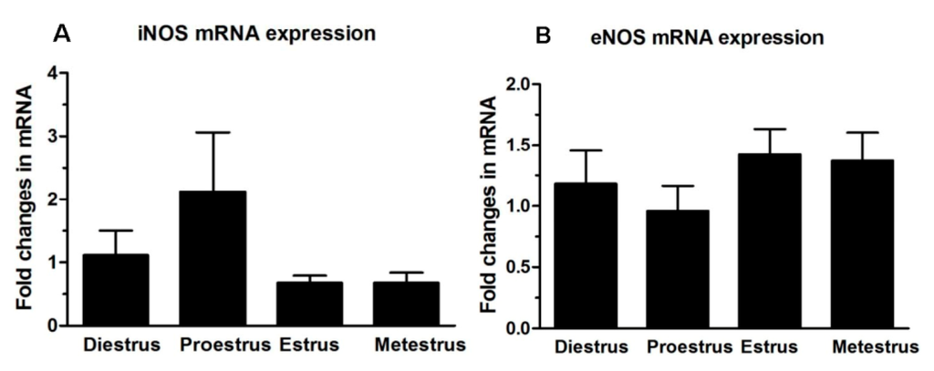 2.1. Nitric Oxide Synthase (NOS) Isoform Expression during the Estrous Cycle in Mouse Fallopian Tubes