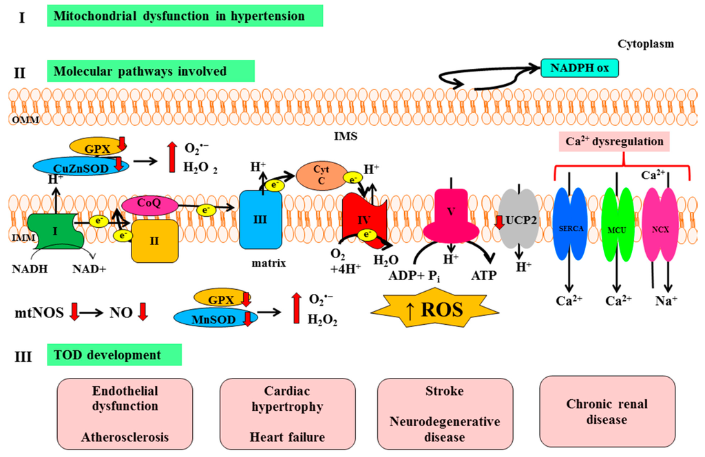 Representation of main molecular pathways linking mitochondrial dysfunction with TOD development in hypertension. NAD: Nicotinamide adenine dinucleotide; NADPH ox: Nicotinamide adenine dinucleotide phosphate oxidase; GPX: Glutathione peroxidase; CuZnSOD: Copper–zinc superoxide dismutase; CytC: Cytochrome C; CoQ: Coenzyme Q; SERCA: Sarco/endoplasmic reticulum Ca2+–ATPase; MCU: Mitochondrial Ca2+ uniporter; NCX: Na+/Ca2+ exchanger; ADP: Adenosine diphosphate; ATP: Adenosine triphosphate; mtNOS: Mitochondrial nitric oxide synthase; NO: Nitric oxide; MnSOD: Manganese superoxide dismutase; ROS: Reactive oxygen species; TOD: Target organ damage; OMM: Outer mitochondrial membrane; IMS: Intermembrane space; and IMM: Inner mitochondrial membrane; I: Complex I, NADH dehydrogenase; II: Complex II, succinate dehydrogenase; III: Complex III, cytochrome bc1 complex; IV: Complex IV, cytochrome c oxidase; V: Complex V, ATP synthase.