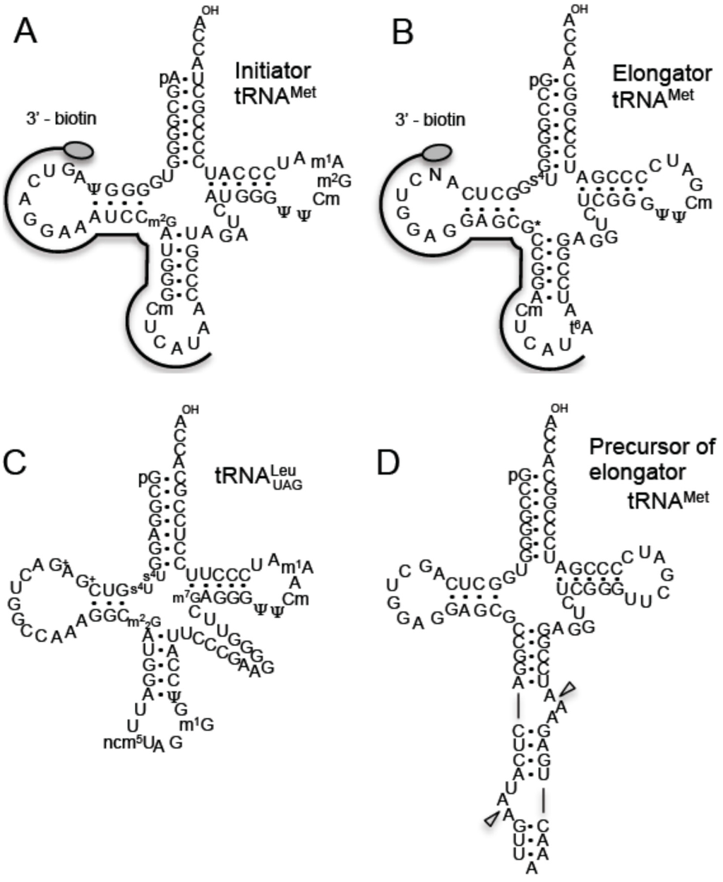 Initiator and elongator tRNAMet were purified by the solid-phase DNA probe method as described in our previous reports [51,52]. The sequences of the 3'-biotinylated DNA oligomers were as follows: for initiator tRNAMet, 5'-ATG AGC CCA TTG GGA TTT CCT GA-biotin 3'; for elongator tRNAMet, 5'-ATG AGT CCG GTG CTC CTC CAG-biotin 3'. The complementary regions are illustrated in Figure 1A,B. The isolated tRNAs were further purified by 10% PAGE (7 M urea).