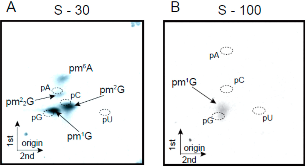 Wet cells (0.3 g) were suspended in 2 mL of buffer A (50 mM Tris-HCl (pH 7.6), 5 mM MgCl2, 6 mM 2-mercaptoethanol, and 50 mM KCl). The cells were ground in a mortar with 0.15 g aluminum oxide and then the suspension was centrifuged at 8000× g for 20 min. The supernatant fraction was centrifuged further at 30,000× g for 2 h. The resultant supernatant fraction was used as the S-30 fraction. The S-100 fraction was the supernatant fraction by that was obtained after centrifugation at 100,000× g for 2 h. Transfer RNA methyltransferase activities in the S-30 and S-100 fractions were analyzed as follows: 30 µg of protein from the S-30 or S-100 fraction, 0.2 A260 units tRNALeuUAG transcript and 0.78 nmol [methyl-14C]-AdoMet were incubated in 40 µL of buffer A at 55 °C for 1 h. The RNA was extracted with phenol-chloroform and then recovered by ethanol precipitation. The RNA pellet was dissolved in 3 µL of 50 mM sodium acetate (pH 5.0), and digested with 2.5 units of nuclease P1 (Wako Pure Chemicals, Osaka, Japan). The sample was separated using 2D-TLC as described previously [64]. The 14C-methylated nucleotides were monitored with a BAS 2000 Bio-imaging Analyzer (Fuji Photo Film, Tokyo, Japan).