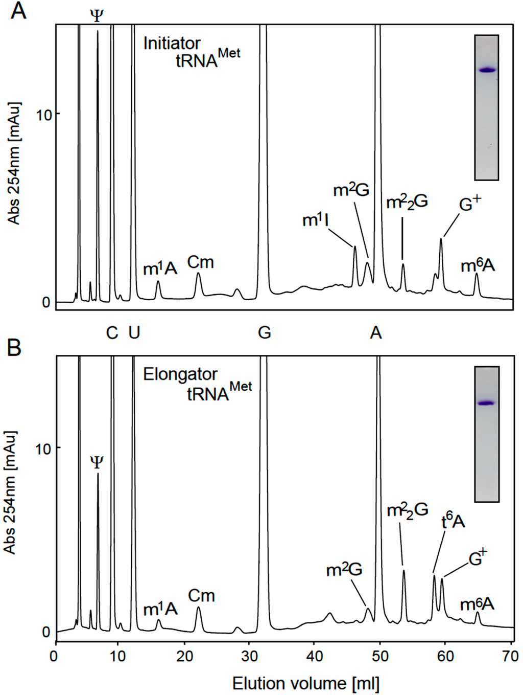 Modified nucleosides in native initiator and elongator tRNAMet. Native initiator and elongator tRNAMet were purified by the solid-phase DNA probe method (insets). The hybridization regions of the probes are illustrated in Figure 1A,B. The modified nucleosides in the initiator (A) and elongator (B) tRNAMet were analyzed by reverse phase column chromatography.