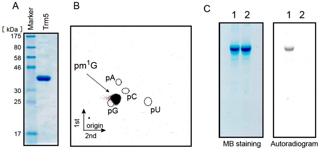 The Ta0836 gene product was expressed in E. coli and purified as shown in Figure 4A. The expected amino acid sequence of the Ta0836 gene product shares a high degree of homology (82%) with that of the identified archaeal Trm5 (Mj0883 of Methanocaldococcus jannaschii) [55,56]. When the purified protein was incubated with the tRNALeuUAG transcript and 14C-AdoMet, the 14C-methyl group was clearly incorporated into the transcript (see Figure 4C lane 1). Analysis of the modified nucleotides by 2D-TLC revealed that the 14C-methylated nucleotide was pm1G (Figure 4B). Furthermore, when the G37 in tRNALeuUAG transcript was replaced by A, no methyl group incorporation was observed (Figure 4C lane 2), which indicates that the methylation site is G37. From these results, we concluded that the Ta0836 gene product is the T. acidophilum Trm5 protein. Given that the m1G modification was previously found only at position 37 in tRNALeuUAG in T. acidophilum ([28] and Figure 1C), the m1G modification activity in the S-100 is probably derived from Trm5.
