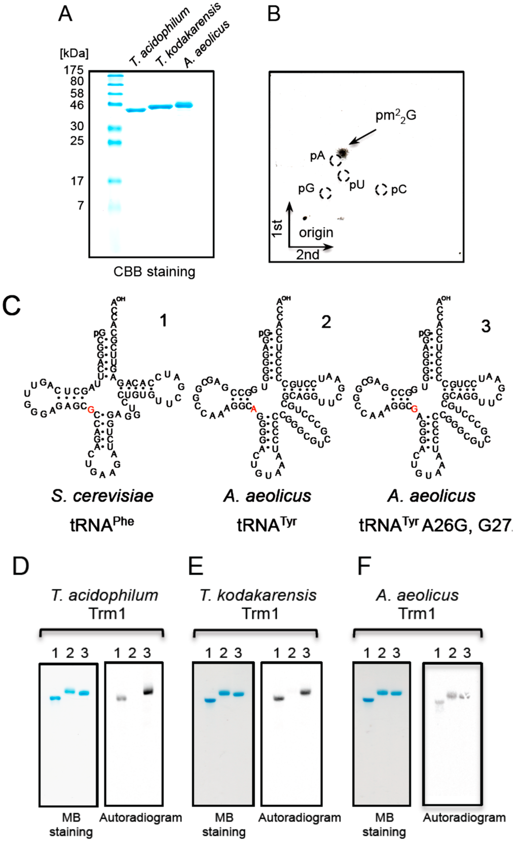 T. acidophilum Trm1 (the Ta0997 gene product) is a single-site-specific enzyme. (A) The T. acidophilum Ta0997 gene product (left), T. kodakaraensis Trm1 (center) and A. aeolicus Trm1 (right) (2 µg each) were analyzed by 15% SDS-PAGE. The gel was stained with Coomassie Brilliant Blue; (B) The tRNALeuUAG transcript was methylated by the Ta0997 gene product and then the generated methylated nucleotide was analyzed by 2D-TLC; (C) The sequences of S. cerevisiae tRNAPhe, A. aeolicus tRNATyr and A. aeolicus tRNATyr A26G, G27A are depicted by cloverleaf structures. These tRNA transcripts were previously used to determine the site specificity of A. aeolicus Trm1, which is a multi-site-specific Trm1. The nucleotides at position 26 in the tRNA transcripts are colored red. The transcript numbers (1, 2, and 3) correspond to the lane numbers in panels (D–F). (D) The tRNA transcripts (0.1 A260 units each) were incubated with the Ta0997 gene product (T. acidophilum Trm1) and 14C-AdoMet at 50 °C for 5 min, separated by 10% PAGE (7 M urea), and then the gel was analyzed by autoradiography. The left and right panels show the gel stained with methylene blue and its autoradiogram, respectively. T. kodakaraensis (E) and A. aeolicus (F) Trm1 proteins were analyzed by the same method.