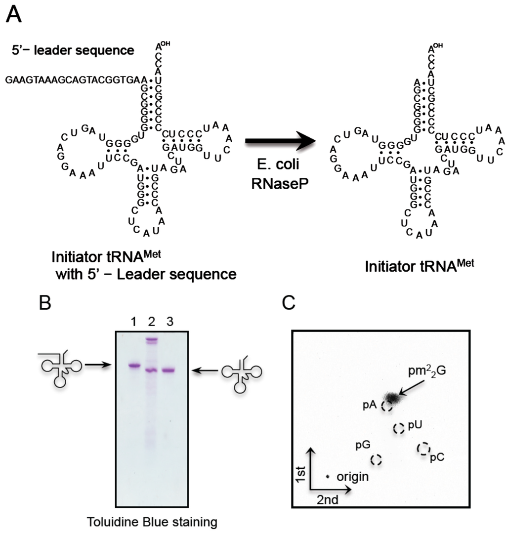 T. acidophilum Trm1 methylates the initiator tRNAMet transcript. (A) Given that the 5'-end of the T. acidophilum initiator tRNAMet is A, the transcript is not synthesized efficiently by T7 RNA polymerase. Consequently, the initiator tRNAMet transcript was synthesized with a 5'-leader sequence by T7 RNA polymerase, purified by 10% PAGE (7 M urea), and then the 5'-leader sequence was removed with E. coli RNase P; (B) The cleavage of the 5'-leader sequence was monitored by 10% PAGE (7 M urea). The gel was stained with toluidine blue. The lanes are as follows: left, initiator tRNAMet with the 5'-leader sequence; center, the reaction mixture; right, purified mature initiator tRNAMet transcript. The M1 RNA in RNase P can be observed at the top of the gel in the center lane; (C) The methylated nucleotide was analyzed by 2D-TLC.