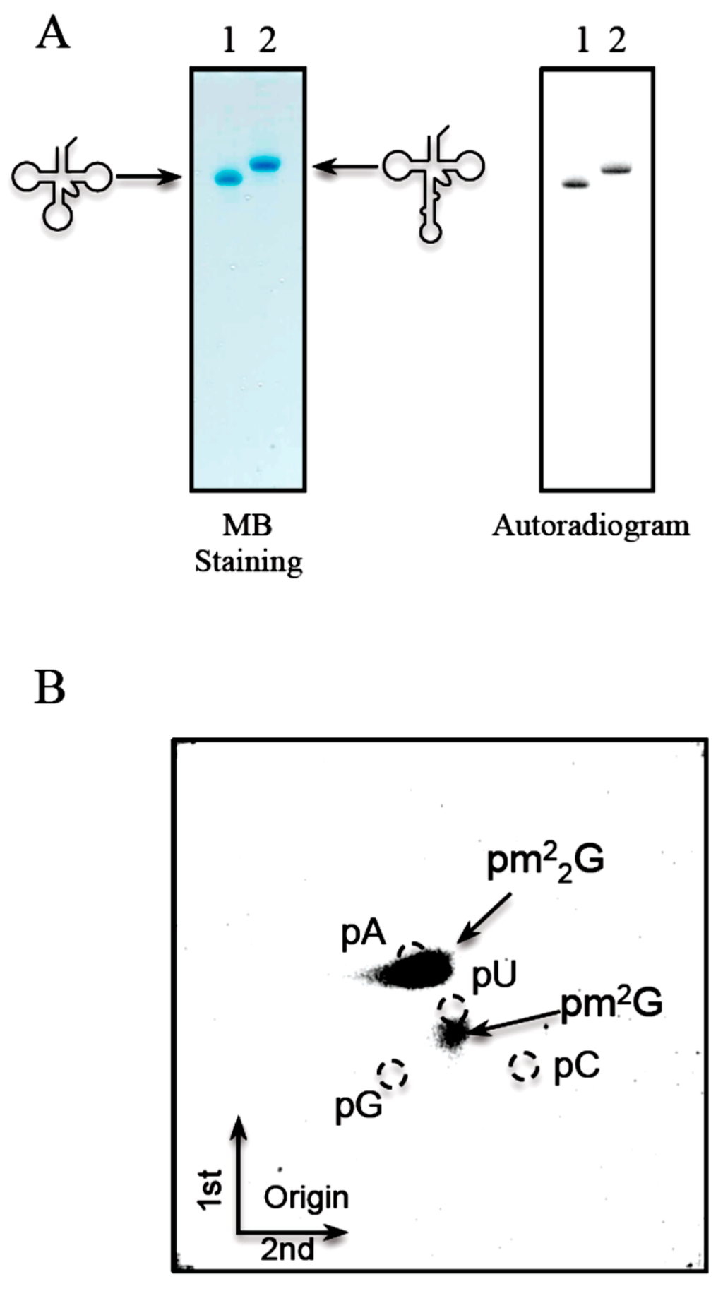 T. acidophilum Trm1 can methylate both the elongator tRNAMet transcript and its precursor, which contains an intron. The mature transcript of elongator tRNAMet and its precursor with an intron (Figure 1D) were prepared. (A) These transcripts were incubated with T. acidophilum Trm1 and 14C-AdoMet at 50 °C for 5 min, and then separated by 10% PAGE (7 M urea) (left panel). The gel was stained with methylene blue. The samples are as follows: lane 1, mature transcript of elongator tRNAMet; lane 2, precursor of elongator tRNAMet with an intron. The right panel shows an autoradiogram of the same gel; (B) The 14C-methylated nucleosides in the mature transcript of elongator tRNAMet were analyzed by 2D-TLC.