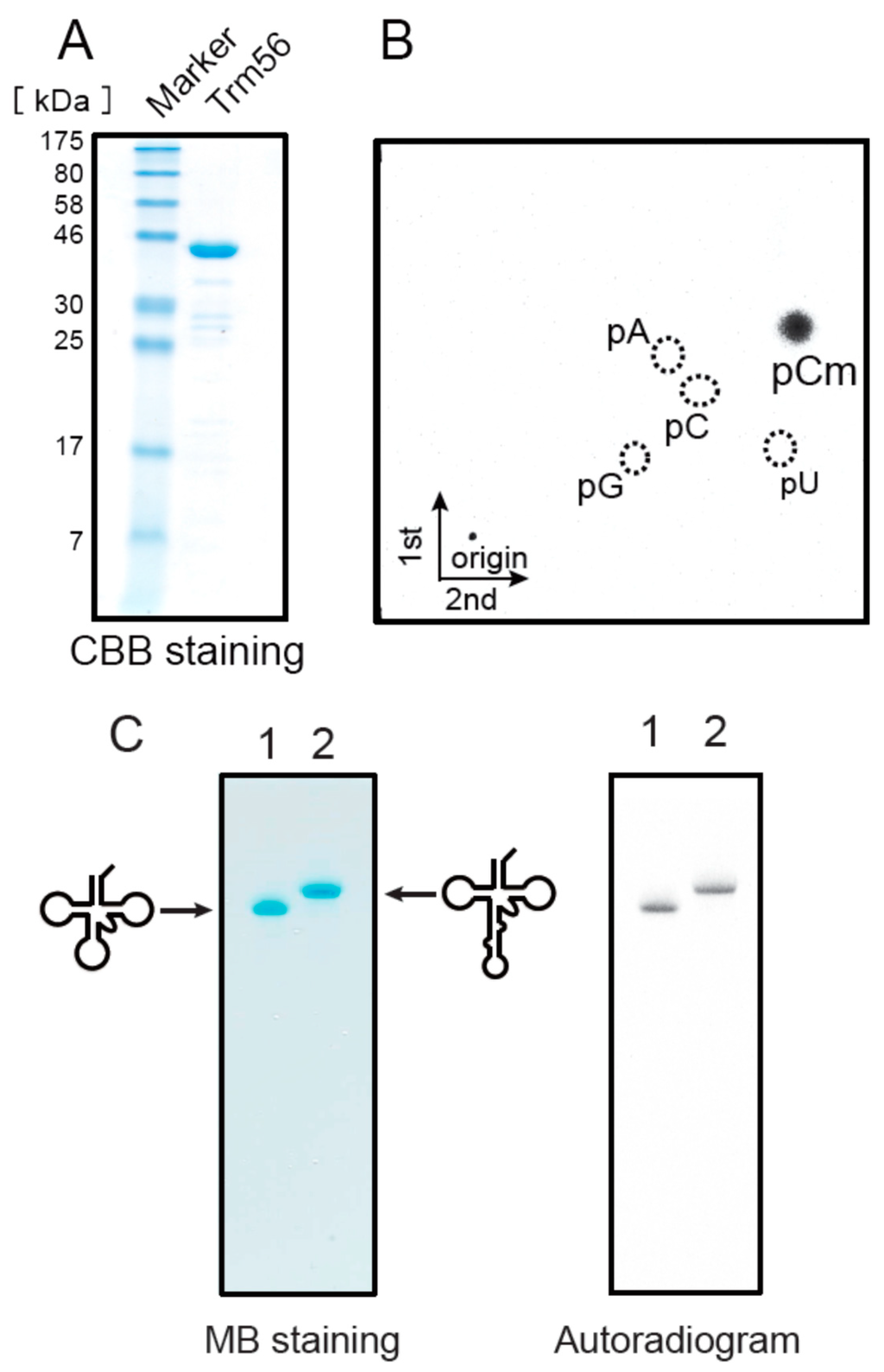 Briefly, Trm56 was purified by heat treatment at 50 °C for 30 min, followed by successive rounds of column chromatography through HiTrap Q-Sepharose, HiTrap Heparin-Sepharose, and HiLoad 16/600 Superdex 200 pg. The final eluted protein was dialyzed against buffer B, and concentrated with a Vivaspin 15R centrifugal filter device. Glycerol was added to the purified protein to a final concentration of 50% v/v and the samples stored at −30 °C.