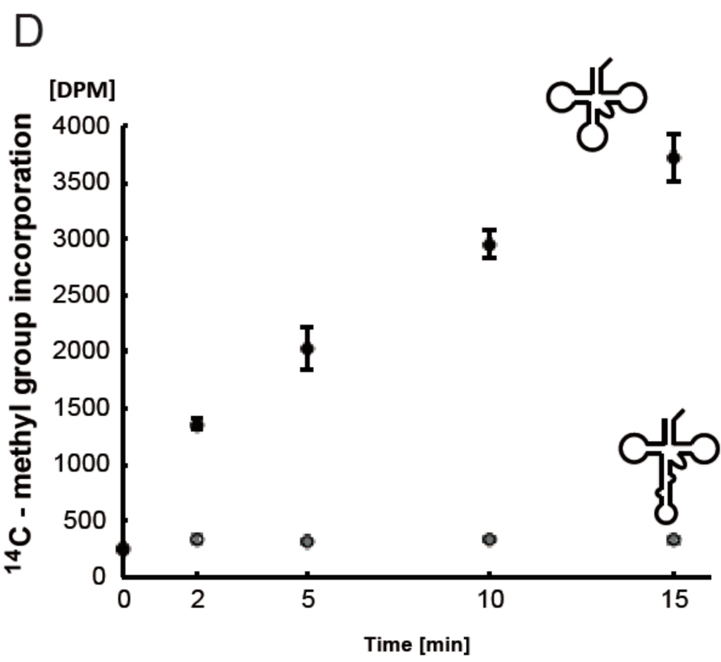 The transcripts were prepared by using T7 RNA polymerase and purified by Q-Sepharose column chromatography and 10% PAGE (7 M urea). The standard assay for the purified enzymes was to measure the incorporation of 14C-methyl groups from [methyl-14C]-AdoMet into the appropriate tRNA transcript. For the reaction, 66 nM enzyme, 4.25 µM transcript, and 17.3 µM [methyl-14C]-AdoMet were incubated in 40 µL of buffer A at 50 °C for 5 min. An aliquot (35 µL) of the reaction was then used for the filter assay. To visualize the methyl-transfer reaction, we used 10% PAGE (7 M urea) and autoradiography. Briefly, tRNA (0.1 A260 units) was incubated with 66 nM enzyme and 17.3 µM [methyl-14C]-AdoMet at 50 °C for 5 min in 40 µL of buffer A, and then loaded onto a 10% polyacrylamide gel that contained 7 M urea. The gel was stained with methylene blue or toluidine blue, and then dried. The incorporation of 14C-methyl groups into the tRNA was monitored with a Typhoon FLA 7000 laser scanner (GE Healthcare). The 2D-TLC was performed as follows. An aliquot of 1 µg of purified protein, 0.2 A260 units of tRNA transcript and 0.69 nmol of [methyl-14C]-AdoMet were incubated in 40 µL of buffer A at 55°C for 1 h. The RNA was extracted with phenol-chloroform and then recovered by ethanol precipitation. The RNA pellet was digested with 1.5 units of nuclease P1. The sample was separated using 2D-TLC as described previously [64]. The 14C-methylated nucleotides were monitored with a Typhoon FLA 7000 laser scanner (GE Healthcare).