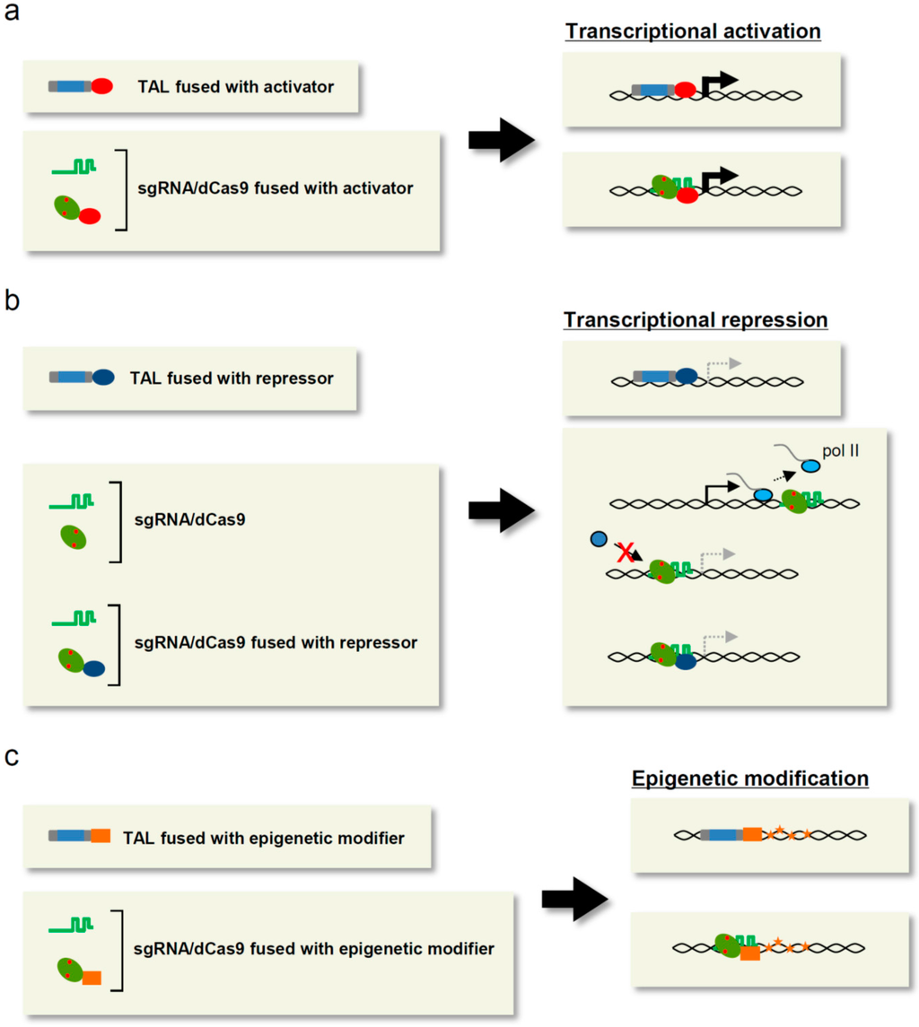 Applications of TAL and CRISPR/Cas to transcriptional/epigenetic regulation. (a) Locus-specific transcriptional activation system. Transcriptional activators fused with TAL or dCas9 increase the transcription of target genes. TAL: grey and blue rectangle. The blue rectangle is the DNA-binding domain; sgRNA: green line; dCas9: green ellipse with two red dots. The red dots indicate point mutations; transcriptional activator: red ellipse; activated transcription: thick bent arrow; (b) Locus-specific transcriptional repression system. Transcriptional repressors fused with TAL or dCas9 suppress the transcription of target genes. Alternatively, it is possible to block elongation of RNA polymerase II (pol II) or recruitment of transcriptional regulators to attenuate the transcription. Transcriptional repressor: blue ellipse; pol II: light blue circle; transcriptional regulator: dark blue circle; transcription: bent arrow; suppressed transcription: dashed bent arrow; (c) Locus-specific modification of epigenetic marks. Epigenetic modifiers fused with TAL or dCas9 alter epigenetic marks on target genes. These modifications may alter the transcriptional status of the relevant genes. Epigenetic modifier: orange rectangle; epigenetic modifications: yellow stars.