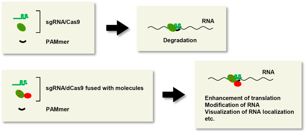 CRISPR/Cas recognizes as its substrate double-stranded DNA (dsDNA) containing the PAM sequence. Recently, O’Connell et al. [77] showed that CRISPR/Cas can bind with high affinity to single-stranded RNA (ssRNA) in vitro when the PAM is presented in trans as a separate DNA oligonucleotide (Figure 4). In this RNA-recognition system, the DNA oligonucleotide (referred to as a PAMmer) anneals with the PAM position of a target ssRNA and stimulates site-specific recognition of the ssRNA by the CRISPR/Cas complex. However, when both a target ssRNA and dsDNA that possesses the sequence corresponding to the ssRNA are present in a reaction, CRISPR/Cas also recognizes the dsDNA as a substrate regardless of the presence of the PAMmer. To avoid such an undesirable reaction with dsDNA, O’Connell et al. [77] improved the design of the PAMmer such that it annealed specifically with non-PAM sites in ssRNA, thereby maintaining the mimicked PAM structure. As a result, CRISPR/Cas specifically recognized and cleaved the 20-base 5′-adjacent to the non-PAM site in the ssRNA, but not the corresponding dsDNA sequence lacking the PAM. In addition to cleavage of ssRNA, they succeeded in isolating the endogenous GAPDH mRNA from HeLa cell lysate by affinity purification using biotin-tagged dCas9, sgRNA, and the improved PAMmer.