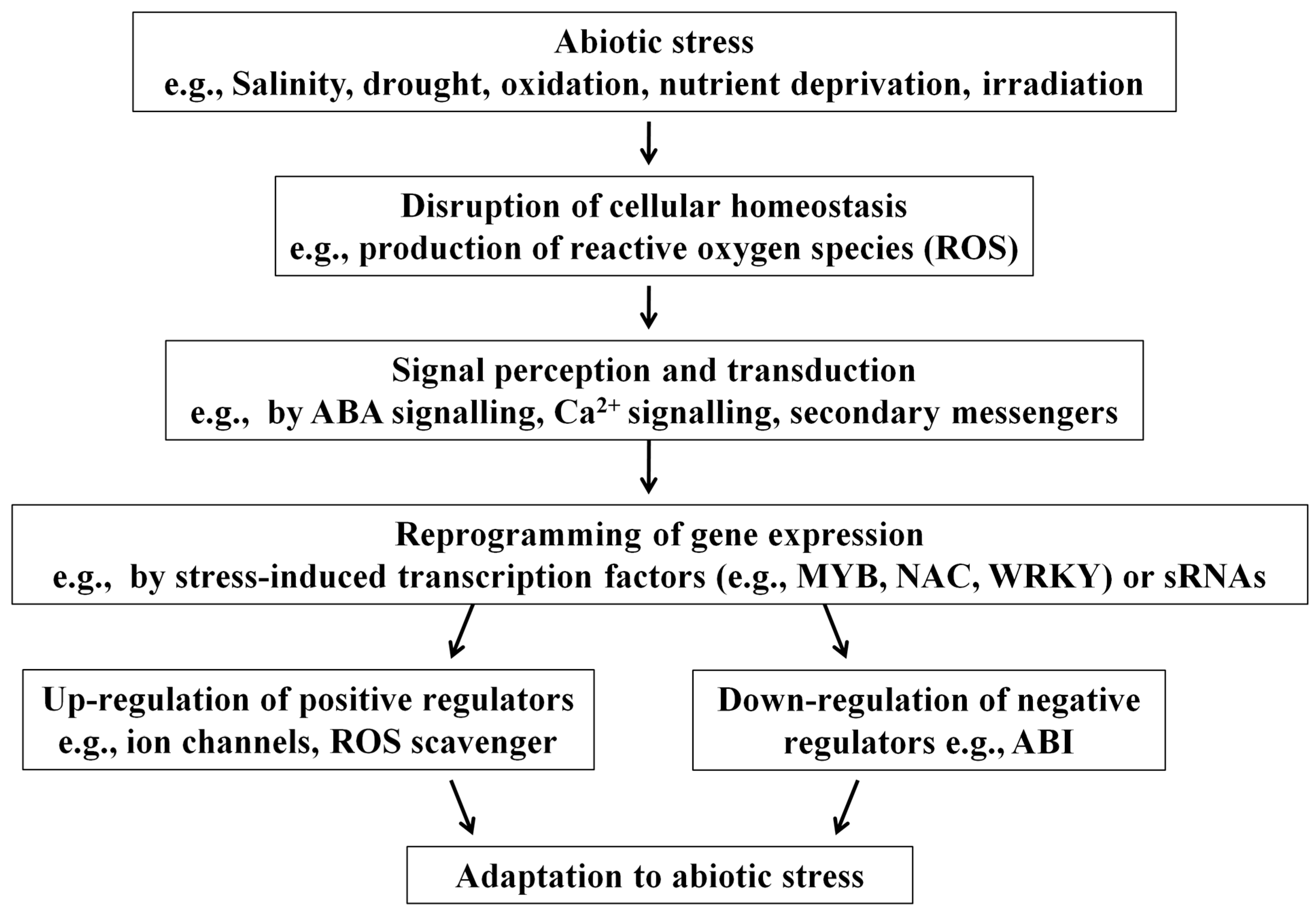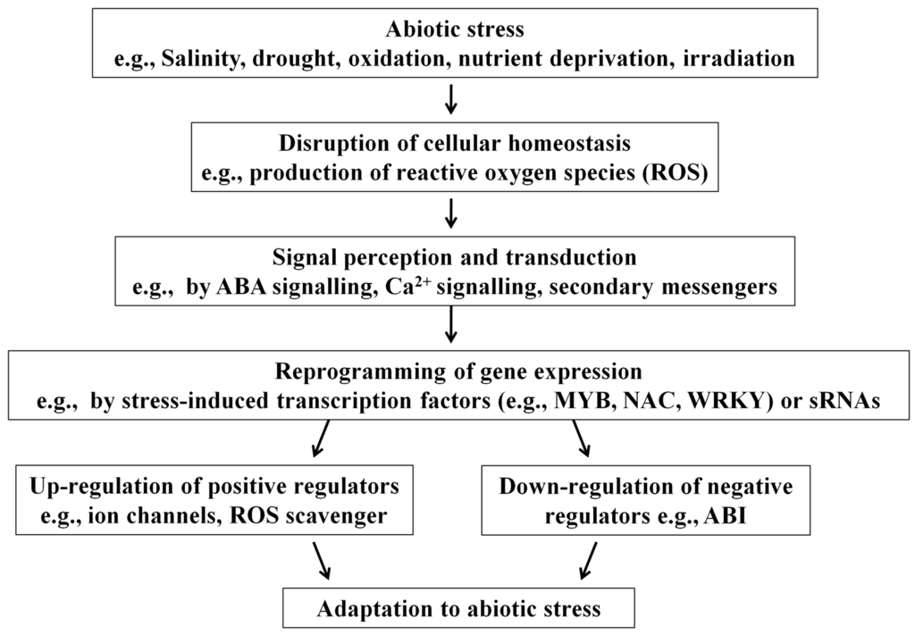 A simplified representation to illustrate the central role of gene expression reprogramming in triggering the adaption to abiotic stresses. Upon abiotic stresses, cellular homeostasis is disrupted. The signal is sensed and transduced by signaling molecules. This brings forth the reprogramming of gene expression which involves transcriptional factors and sRNAs, resulting in the up-regulation of positive regulators and down-regulation of negative regulators.