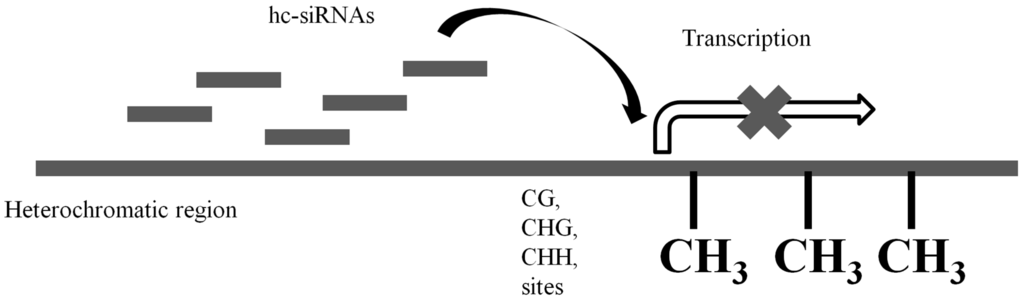 hc-siRNAs are transcribed at the heterochromatic regions where they act in cis to trigger the methylation of cytosine in these sequence contexts: CG, CHG and CHH [17,18,19], resulting in transcriptional silencing.