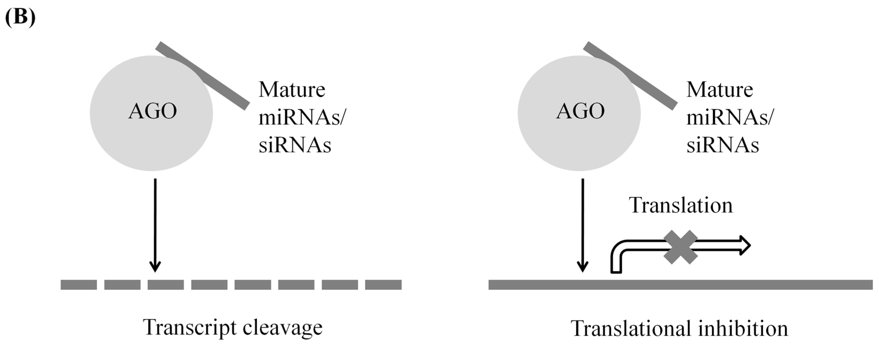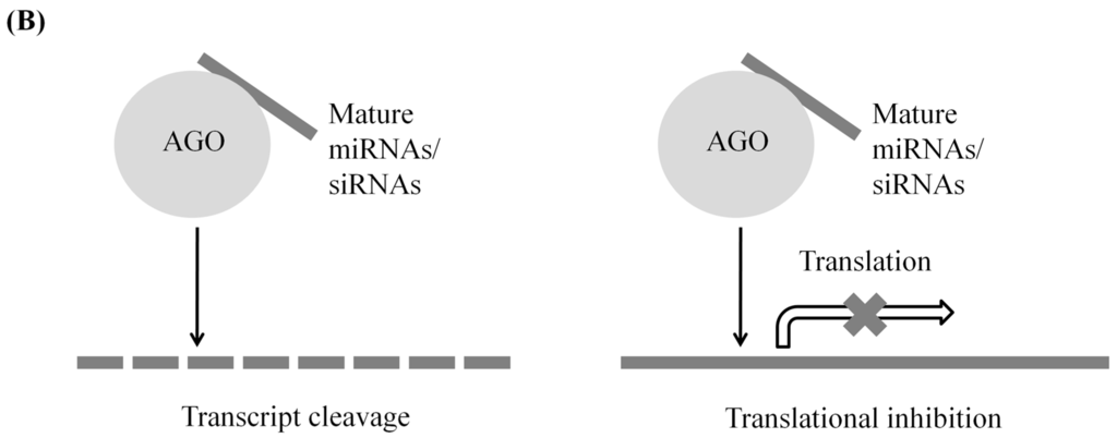 The roles of miRNA and siRNA in PTGS (post-transcriptional gene silencing). (A) The precursor of miRNA is a self-complementary RNA which forms a hair-pin structure while the precursor of siRNA is a dsRNA. The precursors are diced to form mature miRNA or siRNA [7,28,29]; (B) The mature miRNA or siRNA interacts with the AGO (argonaute) protein to form RISC (RNA-induced silencing complexes), which causes the silencing of the target gene by transcript cleavage or translational inhibition [7,28,29].
