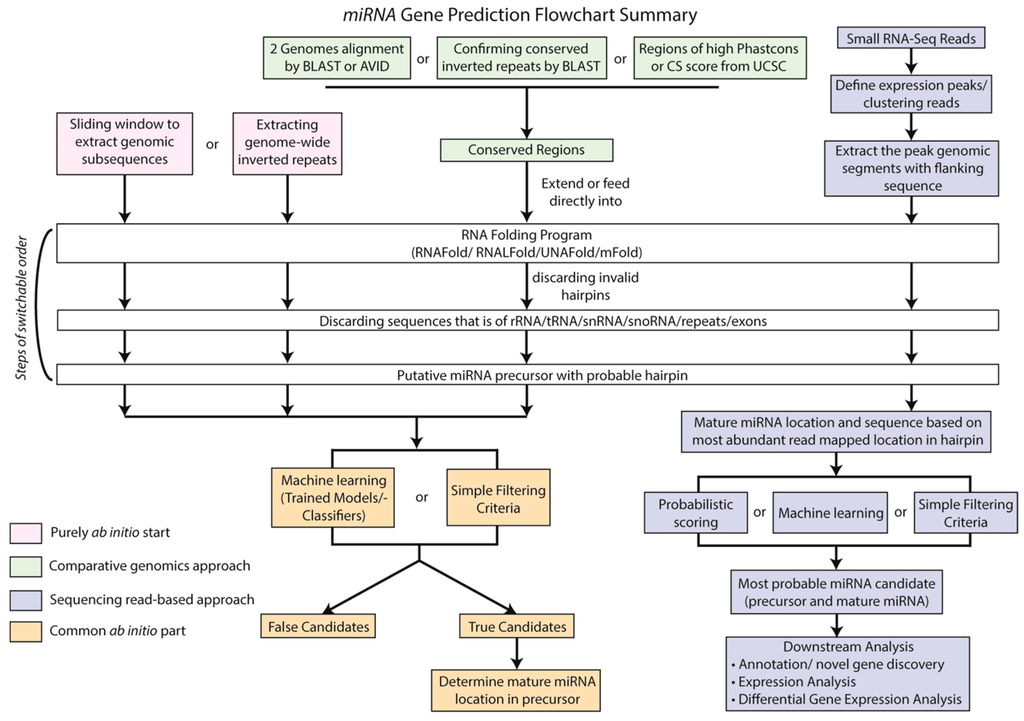 A flowchart for miRNA gene prediction. This flowchart summarized how computational tools predict miRNAs with different approaches. Purely ab initio miRNA prediction programs (pink boxes) use the reference genome of interest as the only starting material to generate miRNA precursor candidates, followed by classifying/filtering with known miRNA properties. In contrast, comparative genomics miRNA prediction programs (green boxes) start with identifying conserved regions between two or more genomes to generate miRNA precursor candidates, followed by the same classifying/filtering step of purely ab initio prediction programs (orange boxes). The sequencing read-based prediction programs (purple boxes) use miRNA expression data to locate possible mature miRNAs. Subsequently, flanking genomic regions of mapped reads are extracted and evaluated whether they pass the criteria of miRNA annotation, using various scoring/classifying algorithms.