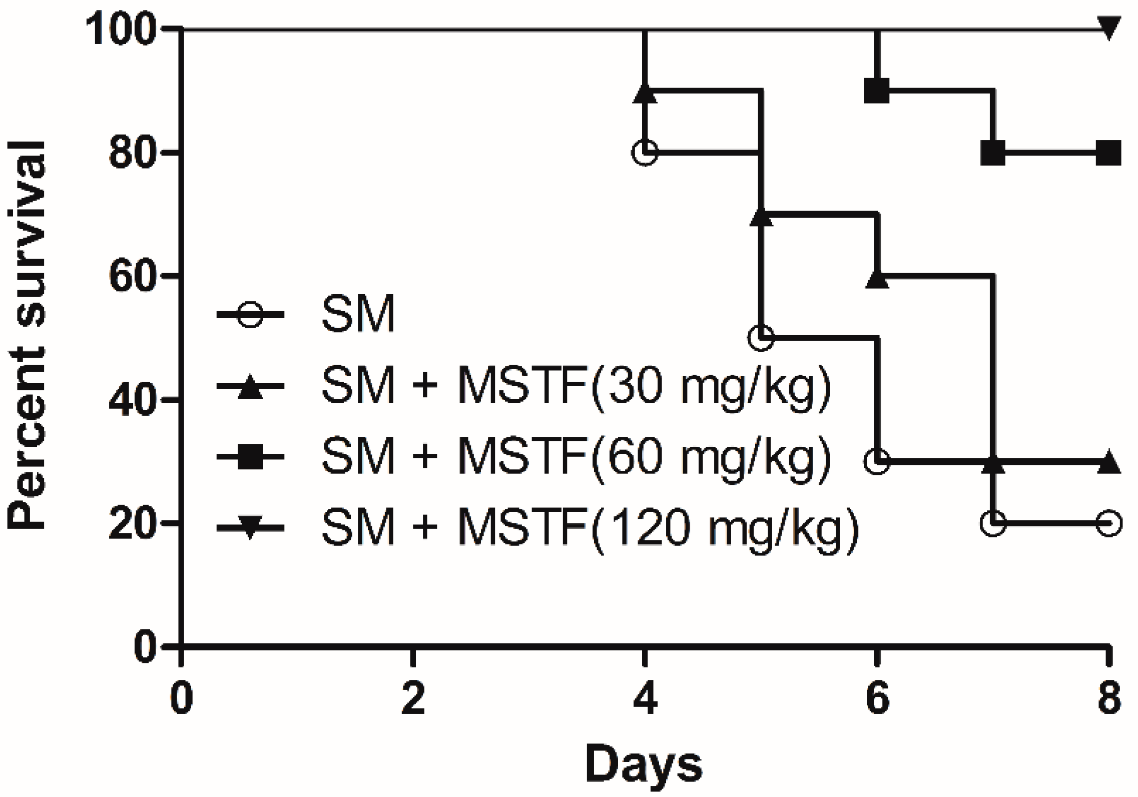 The effect of MSTF on survival time following SM subcutaneous injection is presented in Figure 1. Survival time was calculated on the basis of a seven-day observation period. In general, the rats began to die on the fourth day after SM subcutaneous injection. Treatment with MSTF at doses of 30, 60 and 120 mg/kg for seven consecutive days after SM subcutaneous injection significantly increased the survival levels of rats compared to the SM-alone group (Figure 1). They were 30% at 30 mg/kg, 80% at 60 mg/kg and 100% at 120 mg/kg for the MSTF treated groups, as compared to 20% in the corresponding SM-only group. The log rank test indicated that the survival curves were significantly different (p = 0.0008).