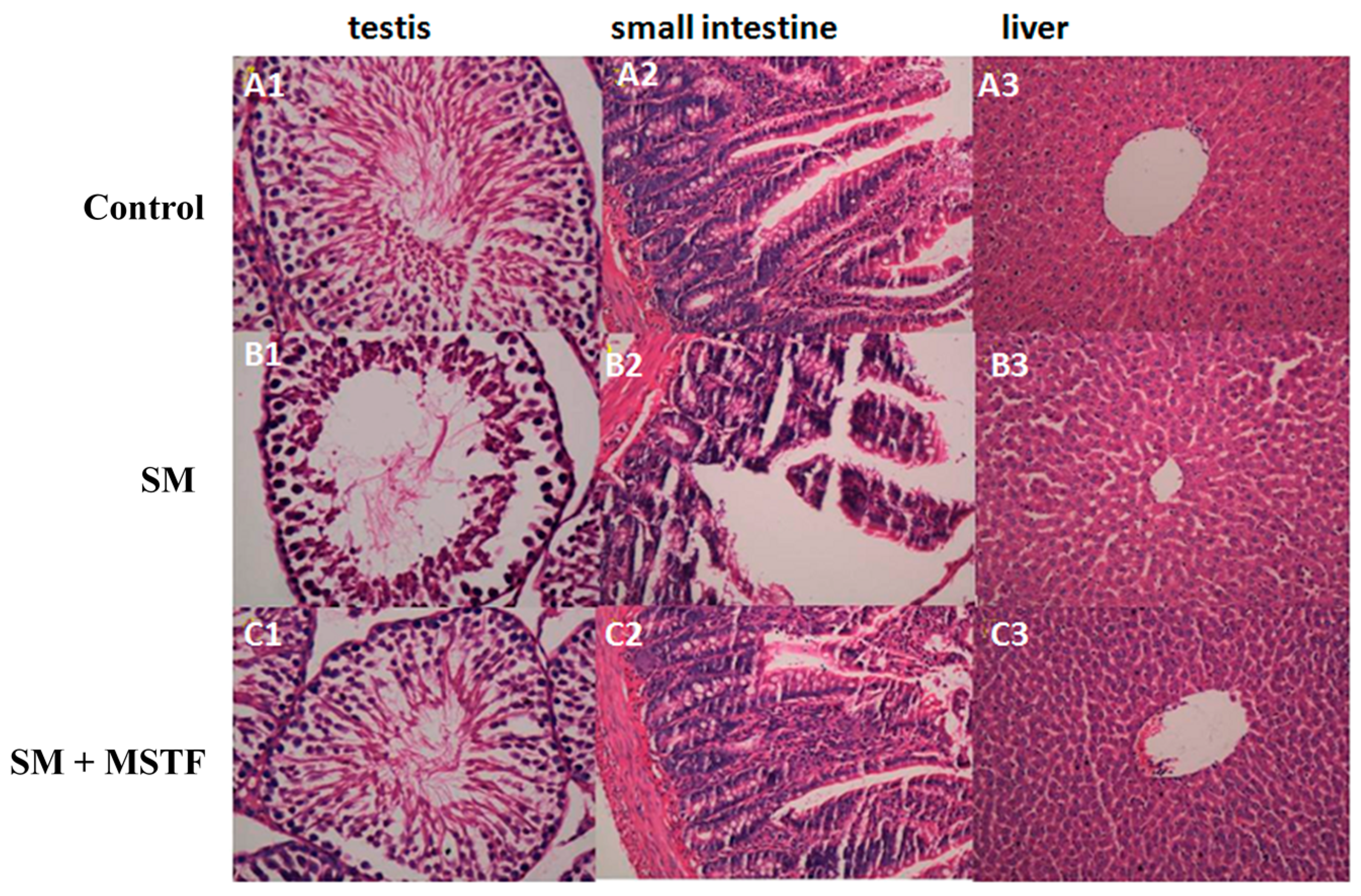 No obvious anomalies were seen in the testis, small intestine and liver tissues of normal control group rats (Figure 2). Significant pathological changes occurred at three days after SM exposure. Damage in testis, liver and small intestine, such as the decrease of sperm cells, the villus epithelial shedding of small intestinal cells, the defects of the gut mucosal barrier, as well as the mild swelling of liver cells, were observed, respectively (Figure 2B1–3). The damages were ameliorated by MSTF treatment at a dose of 120 mg/kg in the testis, liver and small intestine (Figure 2C1–3). These results illustrated that treatment of rats with MSTF after exposure to SM significantly attenuated the SM-induced morphological changes in the testis, small intestine and liver tissues, confirming the therapeutic effects of MSTF on SM-induced tissue injury.