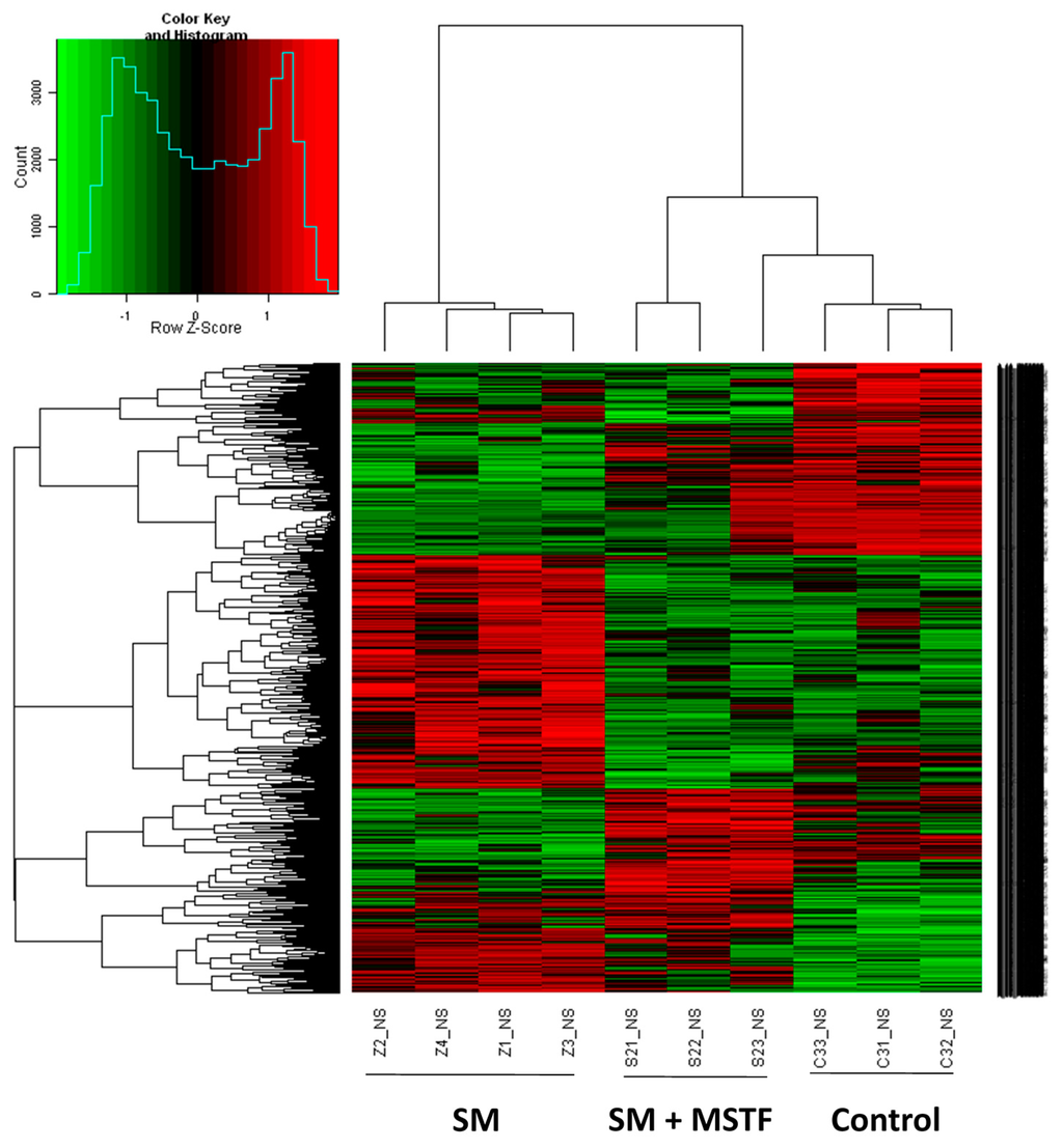 Hierarchical cluster analysis of individual rats according to the profile of gene expression examined. The whole genome microarray was conducted on rat liver tissues 24 h after the application of SM. Then, 4869 transcripts (probe sets) were organized by hierarchical clustering based on overall similarity in expression patterns. Red represents relative expression greater than the median expression level across all samples, and green represents an expression level lower than the median. Black indicates intermediate expression. Rats from the same treatment group are the closest. The control group is close to the SM + MSTF group treated with MSTF (120 mg/kg) 1 h after SM treatment and clearly separate from the SM-only-treated group.