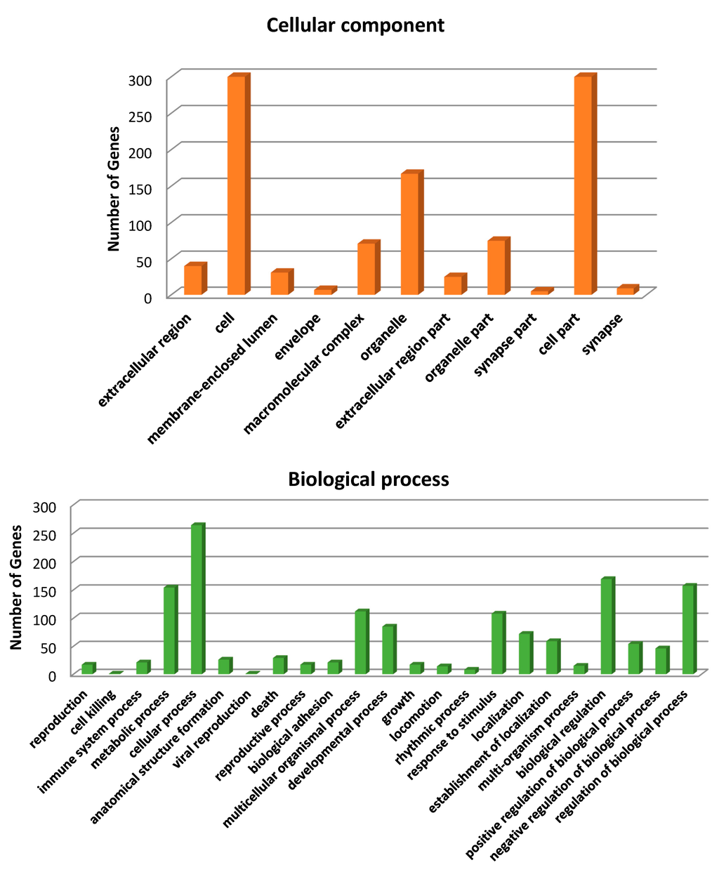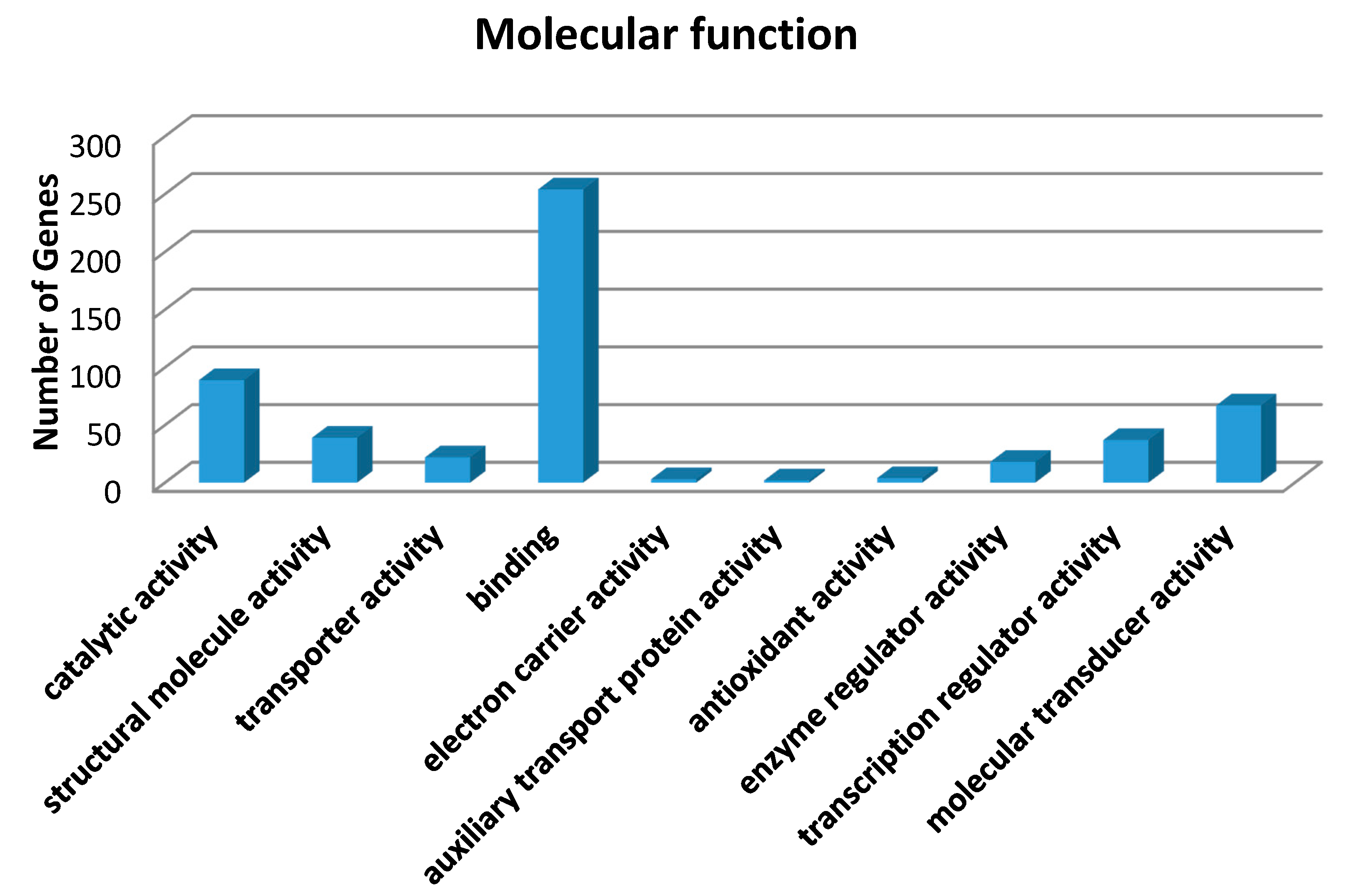 Gene ontology (GO) annotation was further performed for these genes in terms of biological process, molecular function and cellular component. The distribution of the genes in different GO categories at Level 2 is shown in Figure 4. The highly-represented GO terms were cellular process, biological regulation, metabolic process and response to stimulus for biological processes, binding, catalytic activity and molecular transducer activity for molecular function, cell parts, cells and organelles for the cellular component.