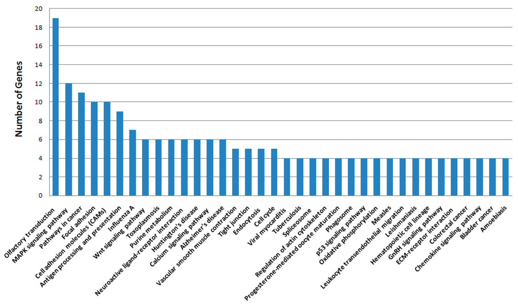 Pathway enrichment analysis indicated that these genes were mainly involved in a total of 36 pathways, such as the MAPK signaling pathway, pathways in cancer, focal adhesion, cell adhesion molecules (CAMs), antigen processing and presentation, purine metabolism and the p53 signaling pathway (Figure 5). For example, the 12 genes presented in Table 2 were involved in MAPK pathways. Other pathways examined include: pathways in cancer (Table 3: 10 genes), focal adhesion (Table 4: 10 genes), cell adhesion molecules (CAMs) (Table 5: 10 genes) and antigen processing and presentation (Table 6: 9 genes).