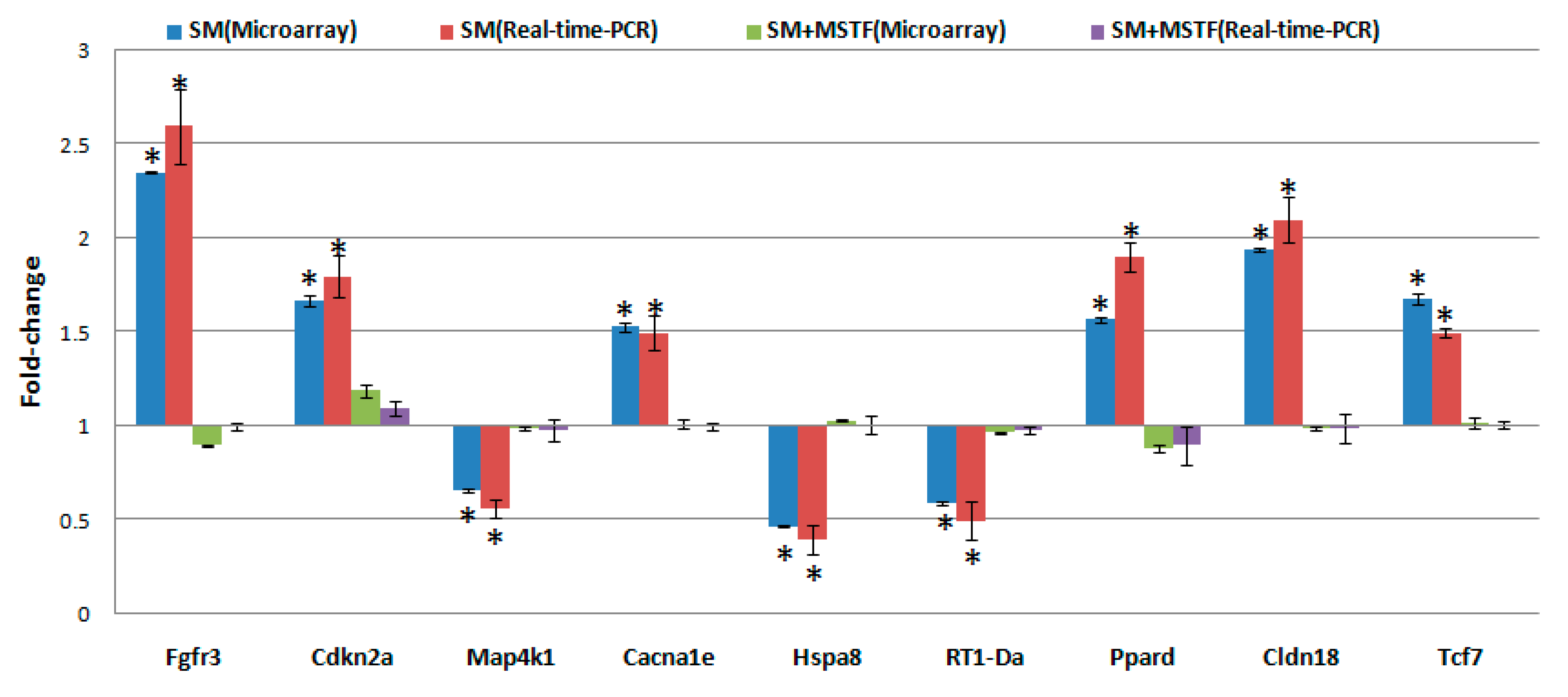 Quantitative real-time PCR confirmation of the microarray data. qRT-PCR was performed on nine genes that showed differential expression in treatment groups (SM, SM + MSTF) versus untreated controls. Gene expression levels are shown as the mean normalized to the expression of the housekeeping gene β-actin. Each sample was measured in triplicate. Columns, mean of three or four rats in the microarray experiment or a mean of five rats in PCR; bars, SD. Asterisks indicates statistical significance compared to the control (non-SM exposed rats) by the t-test (p < 0.05). The comparison of the fold change produced by the microarray with the relative expression ratio obtained from real-time PCR, with good concordance.