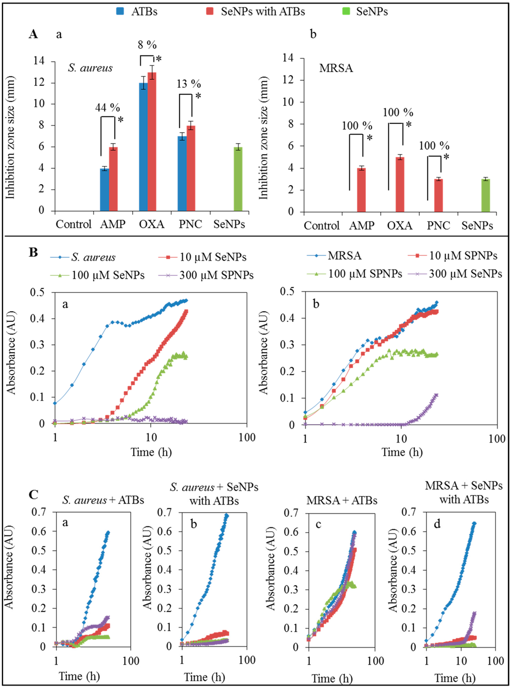 The antibacterial activity of ATBs or their complexes with SeNPs after 24 h was confirmed by the method of the growth curves [21]. The 50% inhibitory concentration was determined in the previous study [21] and for our study, 100 µM concentrations of SeNPs in combination with 100 µM of ATB (Figure 1(Ba,b)) was used. Concentration of SeNPs that showed inhibitory differences between non-resistant S. aureus and MRSA were selected for measurements in this paper. ATBs concentrations were chosen on the basis of previous measurements. For the comparison of ATBs with or without SeNPs, we used only one concentration (100 µM) of ATBs, and it was found that the ATBs applied in combination with SeNPs (100 µM) showed a greater antibacterial effect than ATBs alone. The inhibition effect of ATBs was significant on a non-resistant S. aureus (Figure 1(Ca)). But in the case of MRSA, ATBs, as expected, were mostly ineffective (Figure 1(Cc)). Only oxacillin showed low antibacterial activity with MRSA without antibacterial compounds. The application of complexes of SeNPs with ATBs caused almost complete inhibition of both strains (non-resistant S. aureus and MRSA) in the case of all 3 types of applied ATBs-ampicillin, oxacillin, penicillin (Figure 1(Cb,d)).