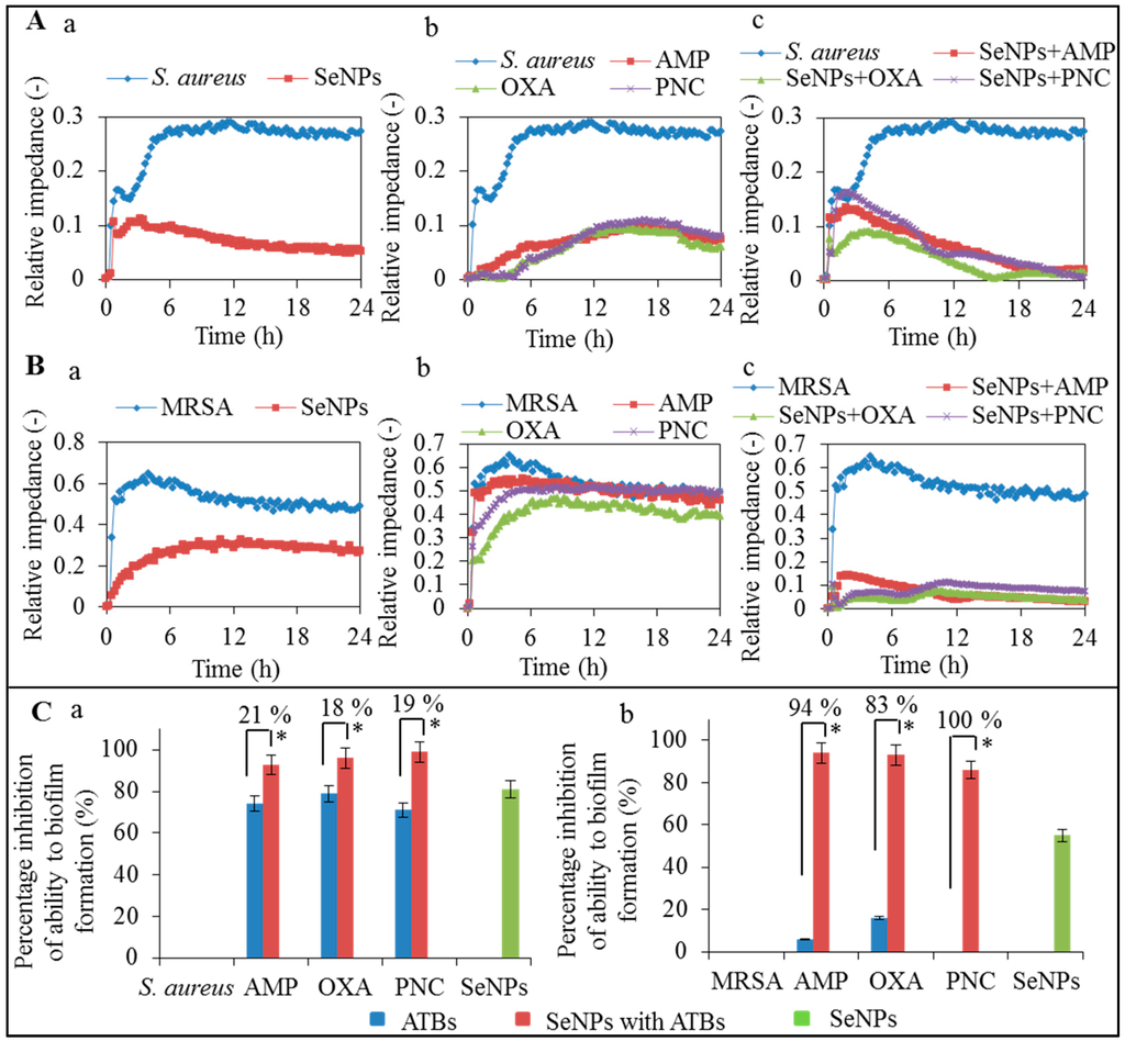 After application of the antibacterial agents, the biofilm is disrupted and bacterial cells are released from the surface of electrodes. This trend is measured as an impedance values and depicted in the graph (Figure 2A,B). The differences in the relative impedance of S. aureus showed decreases in the values of all components applied in comparison with the control, which is caused by balanced violation of the biofilm formed on the electrode surface. In the case of non-resistant S. aureus, ATBs and complexes of SeNPs with ATBs disrupted the bacterial biofilm, and after that a higher effect on these bacteria could be seen (Figure 2A). The biofilm formed by MRSA (Figure 2(Bb,c)) was more resistant to ATBs and complexes of SeNPs with ATBs than the biofilm formed by the non-resistant S. aureus (Figure 2(Ab,c)). Figure 2B shows the percentage decrease of biofilm formation after application of ATBs and complexes of SeNPs with ATBs in comparison with control. The control sample of non-resistant S. aureus reached the relative impedance values of 0.29 and the control sample of MRSA reached 0.52 after 24-h measurement and from these values the decrease of the relative impedance after application of ATBs and complexes of SeNPs with ATBs was calculated. The measurements were performed in triplicates. Low adhesion showed a decreasing trend caused by the biofilm formation on the electrodes, and from this we can conclude that the application of ATBs and complexes of SeNPs with ATBs caused disruption of the biofilm on the electrodes. The results are summarized in Table 1.