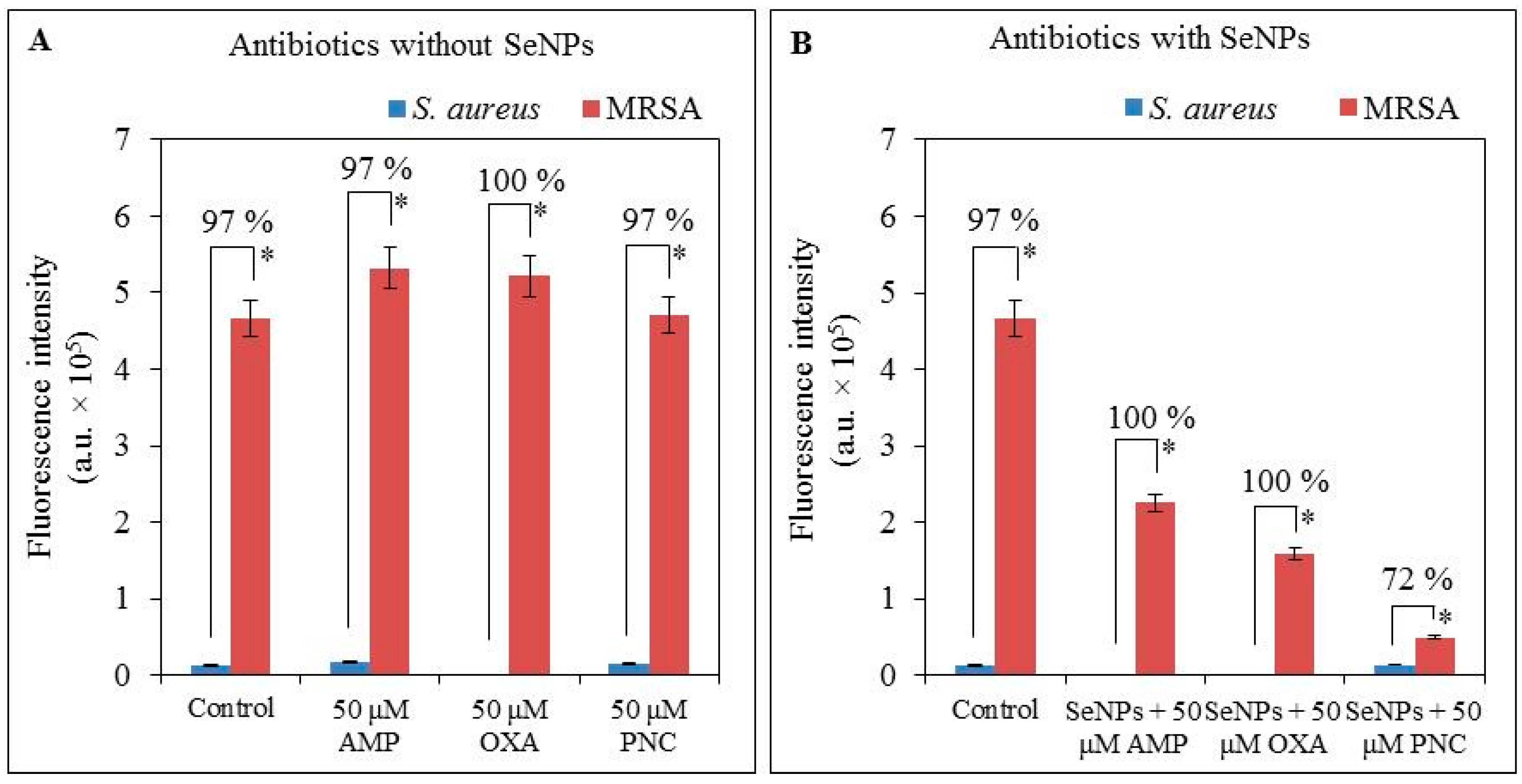 In MRSA, the expression of the mecA gene was decreased after application of ATBs with selenium nanoparticles when compared with expression of the mecA gene in MRSA without antibacterial compounds. Higher fluorescence intensity of mecA gene expression was observed in MRSA after incubation with 50 μM of ATBs (ampicillin, oxacillin and penicillin) alone (Figure 3), as compared to complexes of SeNPs with ATBs, for which the fluorescence intensities of expression were 48%, 70% and 90% lower, respectively (Figure 3B).