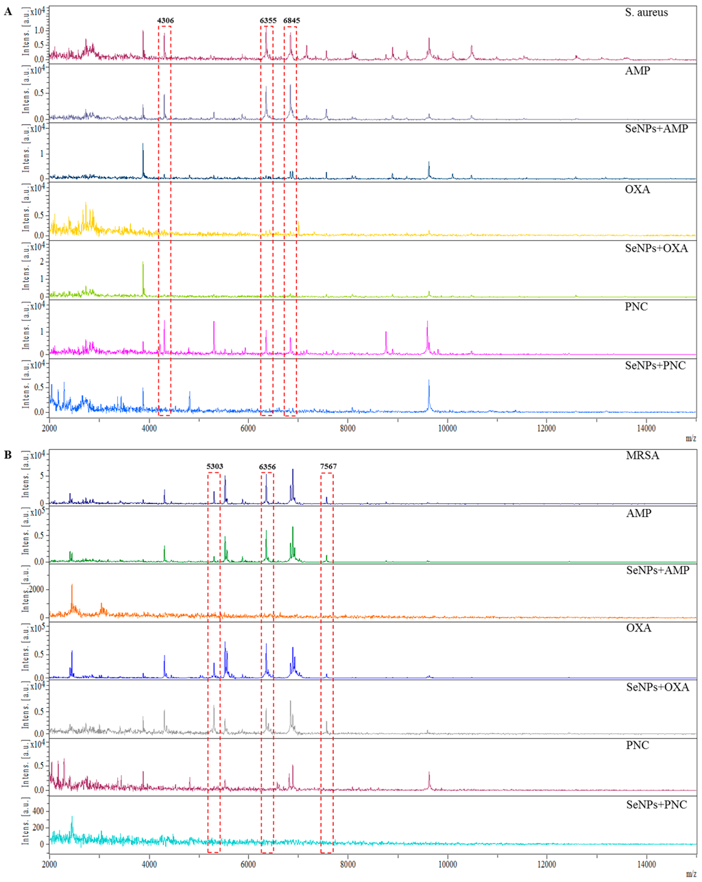 The comparison of MALDI-TOF mass spectra of (A) S. aureus and (B) MRSA with ampicillin, SeNPs with ampicillin, oxacillin, SeNPs with oxacillin, penicillin and SeNPs with penicillin. The analysis was performed in linear positive mode. A solution of 2,5-dihydroxybenzoic acid (concentration 20 mg·mL−1) in 30% acetonitrile and 0%, 1% trifluoroacetic acid was used as a matrix. The laser power was set to 75%. The highlighted peaks show the biggest differences in compared spectra.