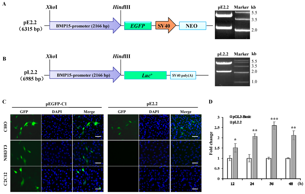 Functional analysis of cloned porcine BMP15 promoter. (A) Reporter vector pE2.2 is derived from pEGFP-1 vector and contains 2.2 kb BMP15 promoter fragment that is confirmed by XhoI/HindIII digestions; (B) Reporter vector pL2.2 is derived from pGL3-basic vector and contains 2.2 kb fragment confirmed by XhoI/HindIII digestions; (C) Cell-specific activation of BMP15 promoter in different cell lines. Scale bar, 100 μm; and (D) Time-dependent luciferase assay for BMP15 promoter activity in CHO cells. The pGL3-Basic vector was used as control. Values are represented as mean ± SD, * p < 0.05, ** p < 0.01, *** p < 0.001, n = 3.