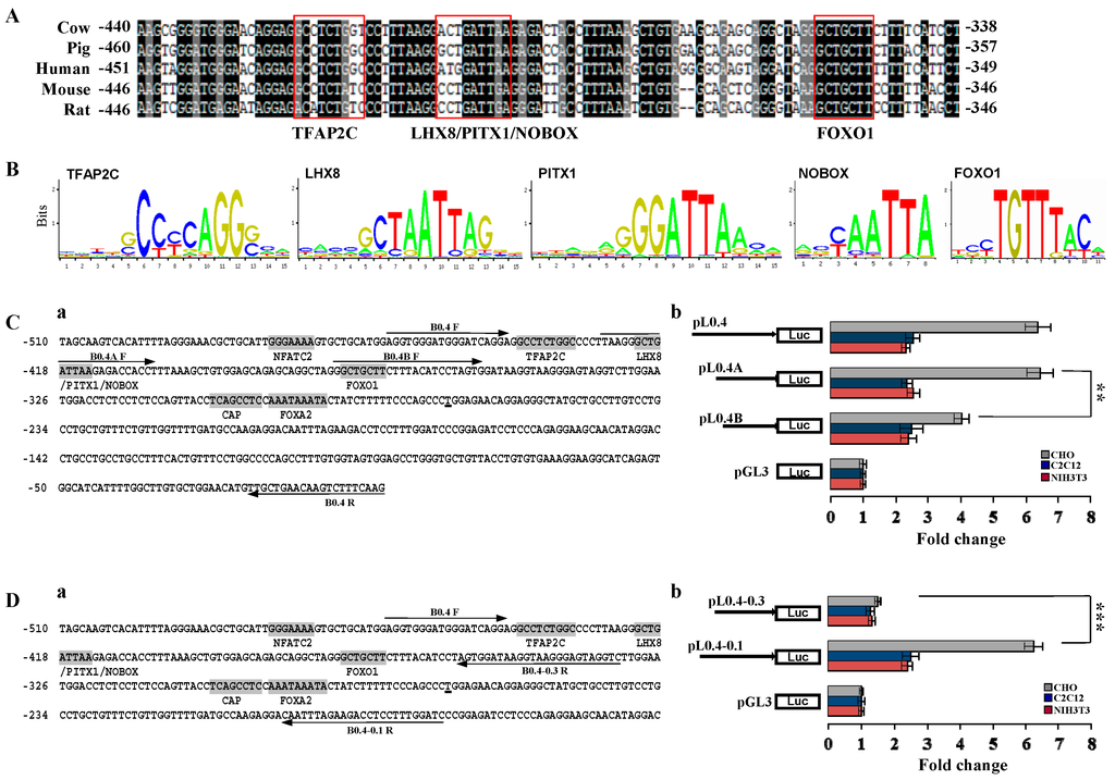 Functional analysis of regulatory elements in porcine BMP15 promoter. (A) Alignment of BMP15 promoter sequences among animal species. The potential DNA binding sites are highlighted in boxes; (B) The consensus sequences of TFAP2C, LHX8, PITX1, NOBOX, and FOXO1 are predicted by JASPAR program (jaspar.genereg.net); (C) The proximal sequence (–460 to –1 bp) of BMP15 promoter has multiple potential DNA binding sites (a). Luciferase assays were performed with different deletion constructs in CHO, C2C12, and NIH3T3 cells (b); and (D) Partial proximal sequence (−460 to −175 bp) of BMP15 promoter region (a). Luciferase assays were performed with different deletion constructs in CHO, C2C12, and NIH3T3 cells (b). The primer sequences used to generate the deletion are indicated by arrows. Values are represented as mean ± SD; ** p < 0.01; *** p < 0.001; n = 3.
