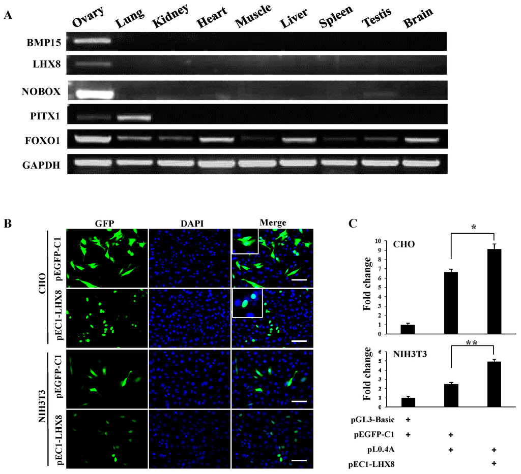 The previous reports have showed that LHX8, NOBOX, and PITX1 are critical factors for the maintenance of oocytes and folliculogenesis [,,]. To investigate whether these genes were expressed in porcine ovary, we prepared mRNA samples from nine porcine tissues and performed the RT-PCR. Results showed that both LHX8 and BMP15 genes highly expressed in ovary tissue, but were undetectable in eight other tissues; PITX1 was expressed in ovary and lung; and NOBOX in ovary and testis. The expression of FOXO1, a gene that plays a wide range of roles in metabolism, cell cycle and tissue differentiation, for instance myogenic growth and differentiation [,], was detected in all somatic tissues (Figure 5A). Thus, we cloned and constructed the LHX8 expression vector pEC1-LHX8. The GFP-LHX8 fusion protein was observed in cellular nuclei, indicating that GFP-LHX8 fusion protein retains the translocation ability (Figure 5B). To determine the regulatory function of LHX8, the vectors pEC1-LHX8 and pL0.4A were cotransfected into CHO and NIH3T3 cells. The activity of the BMP15 promoter was significantly enhanced by overexpression of LHX8 (Figure 5C). This result demonstrates that LHX8 is a potential positive regulator in the upstream signaling pathway of porcine BMP15 gene. Because LHX8 was highly expressed in porcine ovary tissue (Figure 5A) and required for oogenesis in mouse [], we speculate that LHX8 may promote BMP15 gene expression in porcine ovary.