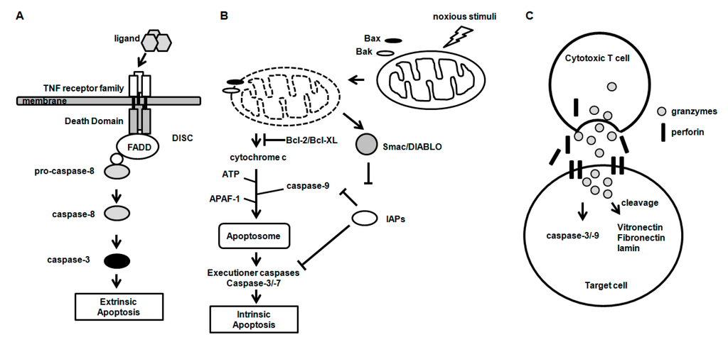Three major mechanisms of apoptosis. (A) Intrinsic and (B) extrinsic apoptosis pathway; and (C) Granzyme-mediated apoptosis pathway.