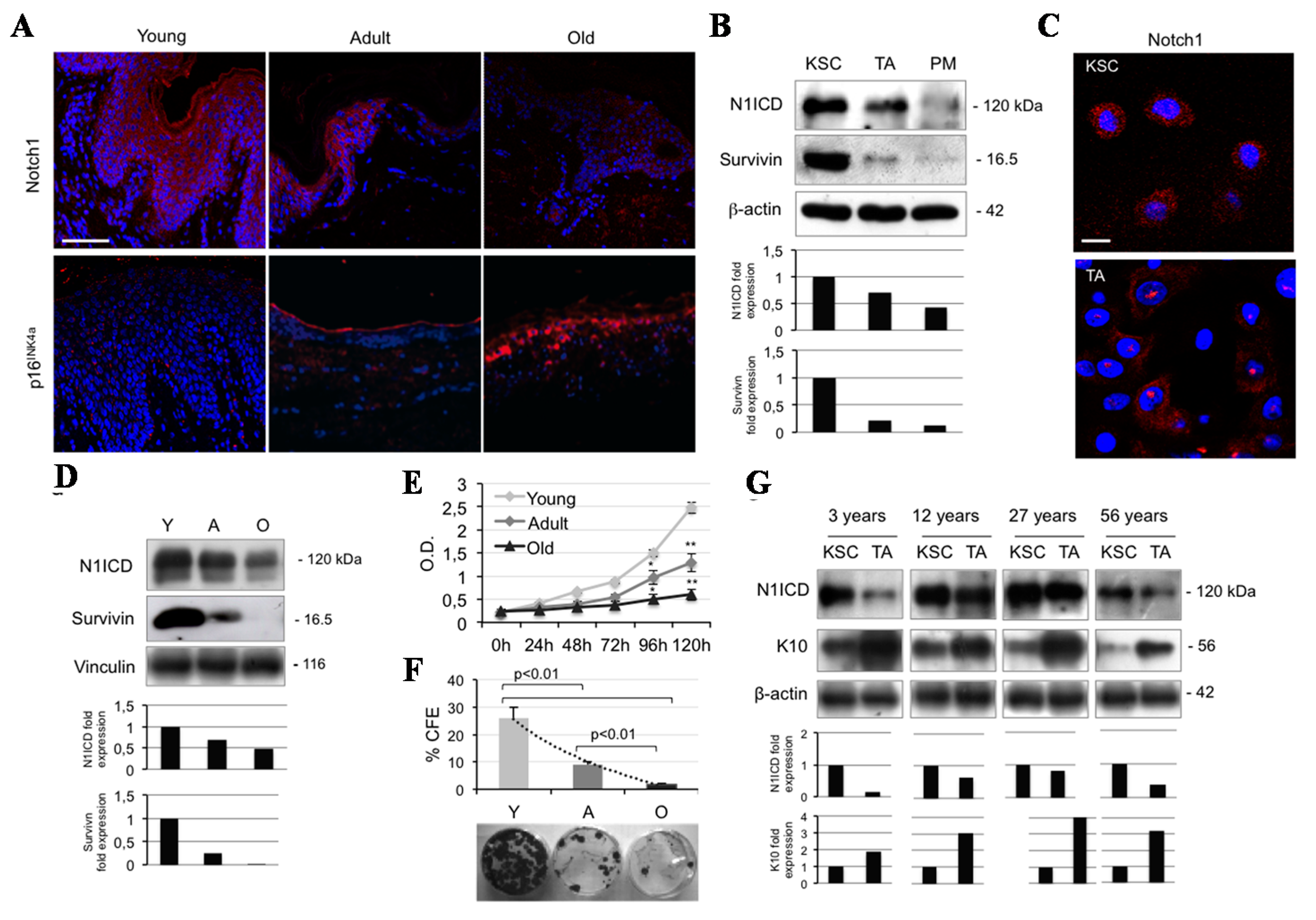 Notch1 levels decrease both during ageing and cell differentiation in human keratinocytes. (A) Immunofluorescence staining for Notch1 and p16INK4a (red) in young, adult, and old skin biopsies. Cell nuclei were counterstained with DAPI (blue) (Bar = 200 µm); (B) Cells were analyzed immediately after separation, and levels of Notch1 activation (N1ICD) and survivin were determined by Western blot (WB) analysis. β-actin was used as loading control. Bar graphs show the average densitometry values normalized to β-actin; (C) Immunofluorescence staining was performed in situ on KSC (keratinocyte stem cells) and TA (transit amplifying) cell culture for survivin expression (red) and cell nuclei were counterstained with DAPI (blue) (Bar = 20 µm); (D) Survivin levels were analyzed immediately after isolation in young (Y), adult (A), and old (O) keratinocytes, and determined by WB analysis. Vinculin was used as loading control. Bar graphs show the average densitometry values normalized to vinculin; (E) The ability to proliferate in vitro of young, adult, and old keratinocytes was evaluated by MTT assay (* 0.01 < p < 0.05; ** p < 0.01); (F) Clonal growth assessment of young, adult, and old keratinocyte by CFE assay. At the bottom, representative pictures of CFE obtained by growing cells at clonal density and stained with CV are shown; (G) KSC and TA cells were analyzed immediately after separation, and levels of N1ICD and K10 (keratin 10) were determined by WB analysis. β-actin was used as loading control. Bar graphs show the average densitometry values normalized to β-actin.