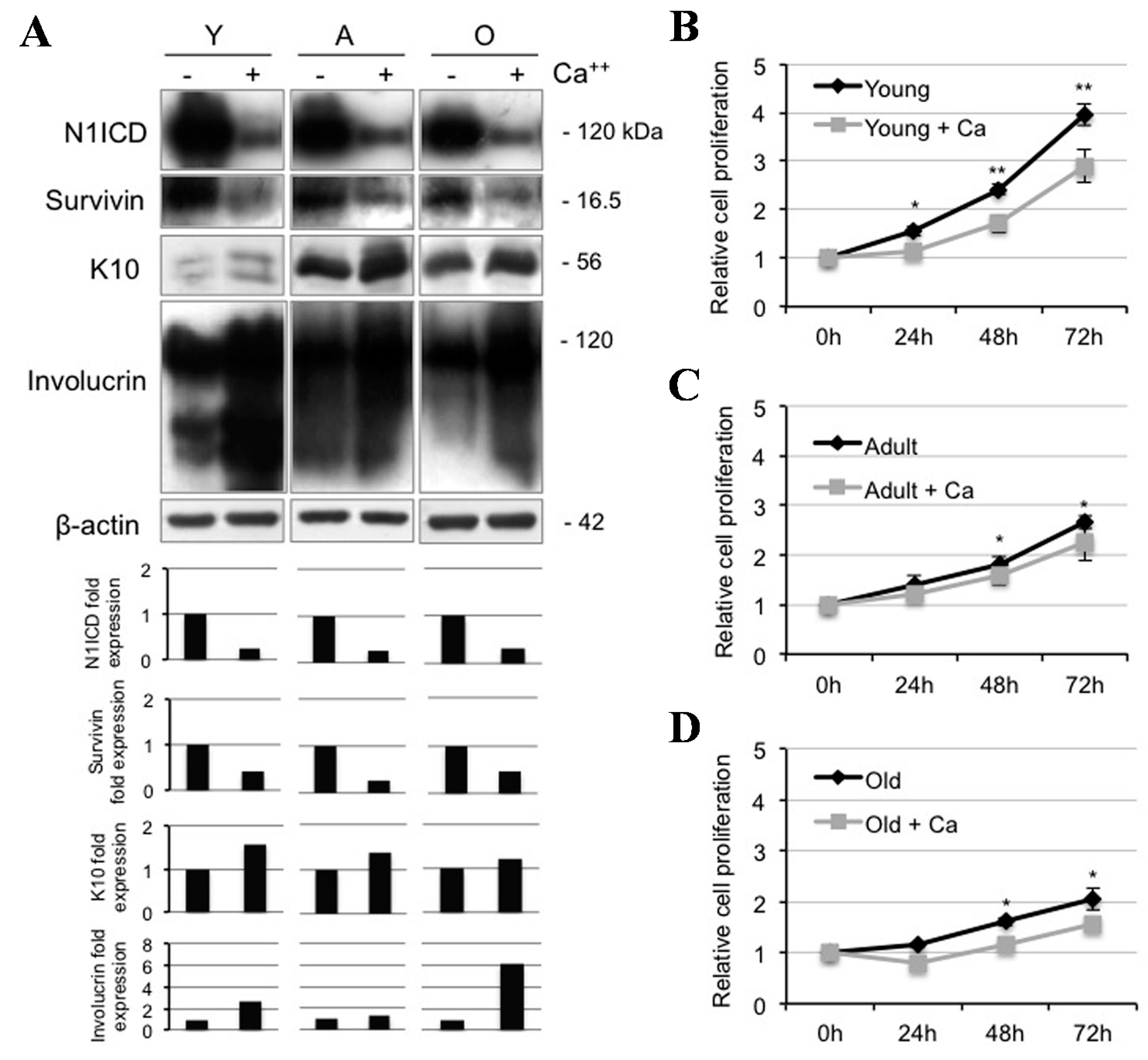 Calcium-induced differentiation decreases Notch1 activation during ageing. (A) Young (Y), adult (A), and old (O) keratinocytes were analyzed 24 h after 1.8 mM calcium treatment, and levels of Notch1 activation, survivin, K10, and involucrin were determined by Western Blotting analysis. β-actin was used as loading control. Bar graphs show the average densitometry values normalized to β-actin; (B) Relative cell proliferation of young keratinocytes with or without 1.8 mM calcium treatment by MTT assay; (C) Relative cell proliferation of adult keratinocytes with or without 1.8 mM calcium treatment by MTT assay; and (D) Relative cell proliferation of old keratinocytes with or without 1.8 mM calcium treatment by MTT assay. * 0.01 < p < 0.05; ** p < 0.01.