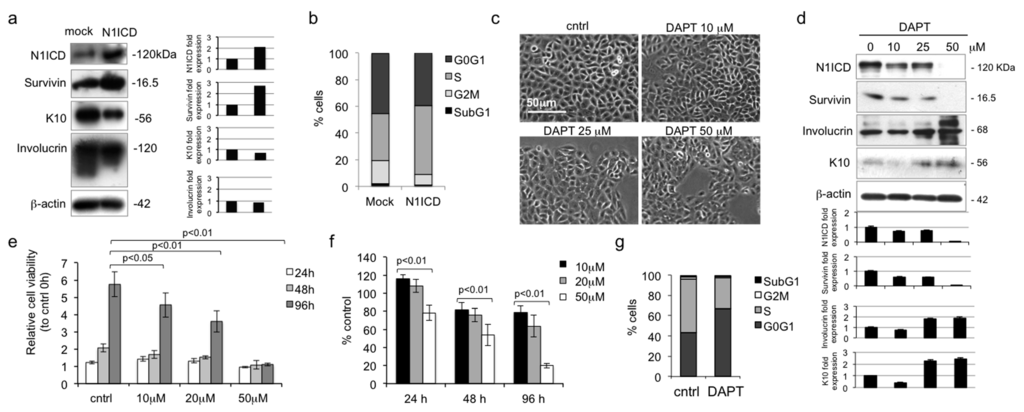 To further understand the role of Notch, young human keratinocytes were infected with N1ICD cDNA. N1ICD overexpression induced the up-regulation of survivin and the down-regulation of K10 and involucrin (Figure 3A). Moreover, N1ICD overexpression markedly increased the S phase of the cell cycle in comparison with mock infected cells (Figure 3B), suggesting a role of Notch1 in keratinocyte proliferation. To confirm the effects of Notch1 in human keratinocytes, we first used an inhibitory approach, by using the γ-secretase inhibitor DAPT (0–50 µM). DAPT dose-dependently inhibits the achievement of keratinocyte confluency (Figure 3C). In addition, increasing doses of DAPT down-regulate survivin and up-regulate K10 and involucrin (Figure 3D), while reducing keratinocyte proliferation. In particular, at 48 and 96 h, we observed a significant decrease in keratinocyte proliferation in a dose-dependent manner (Figure 3E). When measured as percentage of control, increasing doses of DAPT significantly diminish keratinocyte proliferation at all time points (Figure 3F). Finally, DAPT markedly reduces S phase of the cell cycle (Figure 3G). Hence, these data suggest that Notch1 inversely correlates with differentiation and stimulates keratinocyte proliferation. While Notch signaling differs dramatically between cell types and according to various tissue contexts, most reports seem to suggest that Notch activity is associated with differentiation in both the IFE and the hair follicle [21]. On the other hand, it should be taken into consideration that most functional studies on Notch have been carried out in the mouse system [9], in particular in the hair follicle [26], which cannot be fully extrapolated for human skin. Indeed, it has been recently shown that Notch signaling enhances proliferation of epidermal stem cells by targeting Hes-1 [27]. Finally, this is consistent with the predominant expression of Notch1 in KSC (Figure 1B).