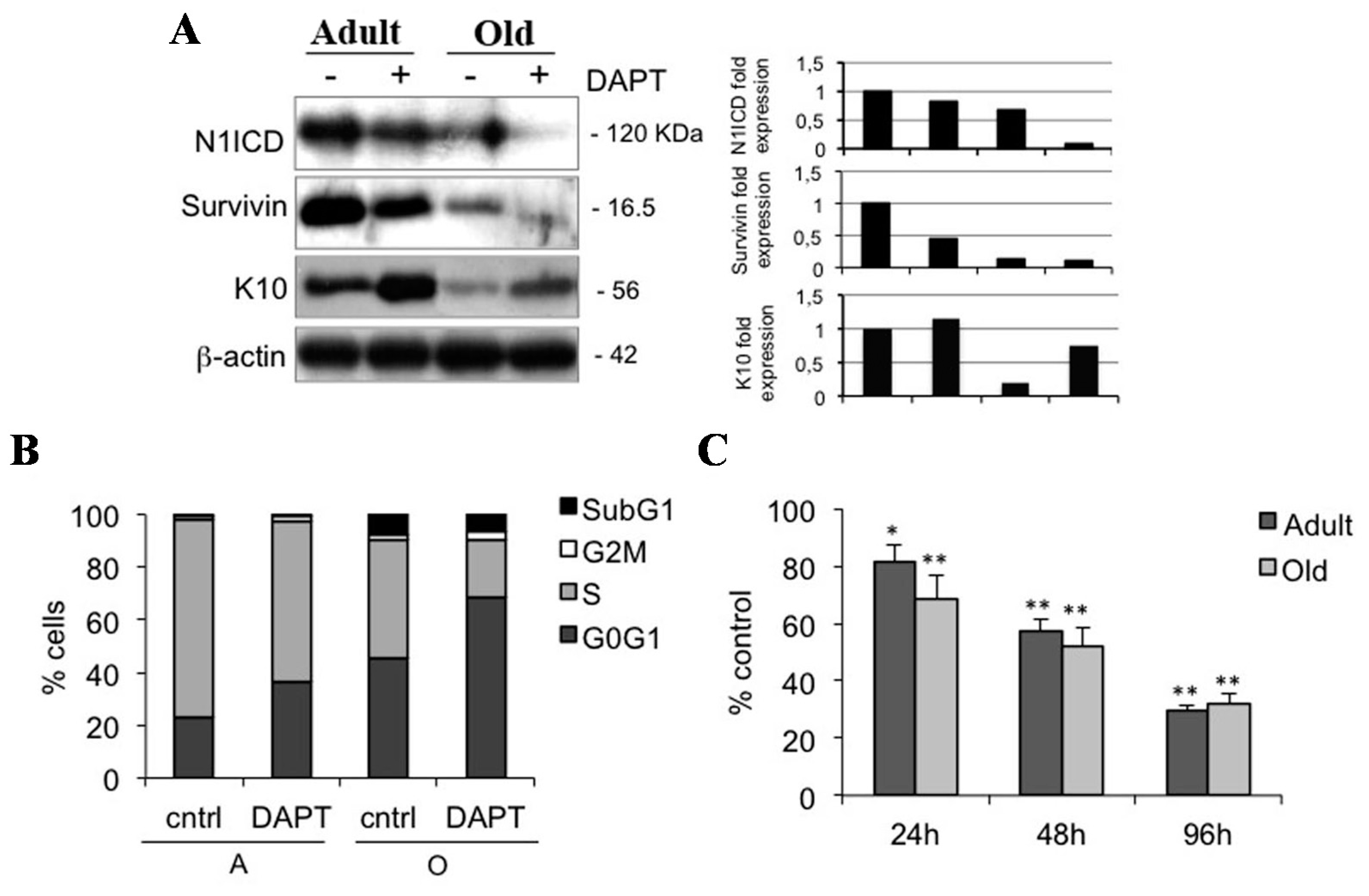 To confirm the role of Notch1 in maintaining cells in an undifferentiated state, we also evaluated the effects of DAPT in keratinocytes from adult and old samples. Similar to what was observed in young keratinocytes, inhibition of Notch1 induces a down-regulation of survivin and an up-regulation of K10 in older specimens (Figure 4A). In addition, DAPT reduces the number of cells in S phase (Figure 4B), and decreases keratinocyte proliferation in samples from adult and old individuals, in a time-dependent manner (Figure 4C). These data confirm that Notch1 also favors keratinocyte proliferation in keratinocytes from older samples, and indicates that a reduced number of cells in S phase in old keratinocytes is consistent with a greater reduction of N1ICD levels in old relative to adult keratinocytes. This suggests that decreased proliferation in aged keratinocytes is associated with the lowest levels of N1ICD.