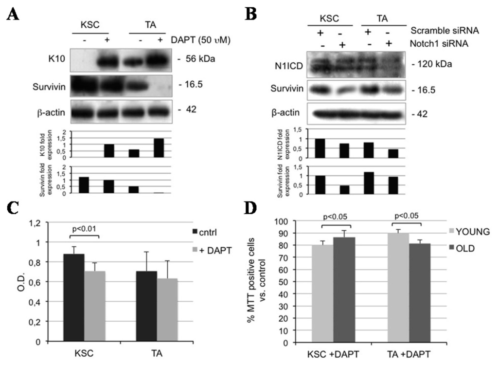 Notch1 inhibition affects both KSC and TA cells. (A) KSC and TA cells were analyzed 24 h after 0 and 50 µM DAPT treatment, and levels of survivin and K10 were determined by Western blotting. β-actin was used as loading control. Bar graphs show the average densitometry values normalized to β-actin; (B) KSC and TA cells were analyzed 48 h after Notch1 silencing, and levels of N1ICD and survivin were determined by Western blotting. β-actin was used as loading control. Bar graphs show the average densitometry values normalized to β-actin; (C) The ability to proliferate in vitro of KSC and TA cells after 0 and 50 µM DAPT treatment was evaluated by MTT assay; (D) Relative percentile quantification of both young and old KSC and TA cell proliferation after 50 µM DAPT treatment by MTT assay. Normalization was calculated compared to control.