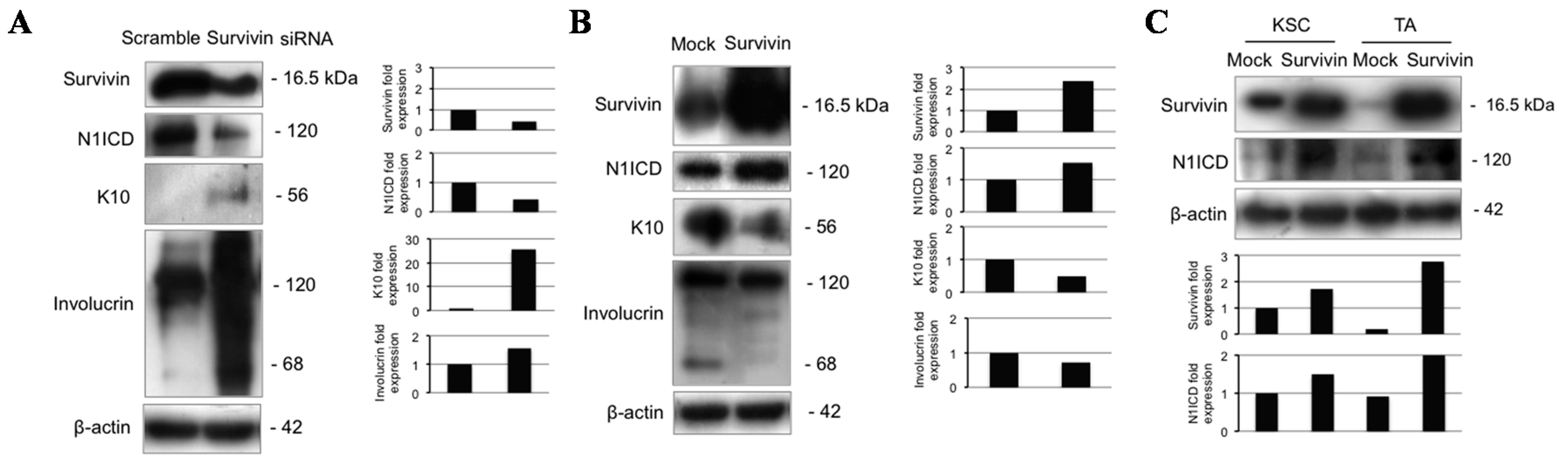 Survivin modulates Notch1 and keratinocyte differentiation. (A) Keratinocytes were analyzed 48 h after survivin silencing, and levels of survivin, N1ICD, K10 and involucrin were determined by Western blotting. β-actin was used as loading control. Bar graphs show the average densitometry values normalized to β-actin; (B) Keratinocytes were analyzed 48 h after pcz-CFG5.1-EGFP or pcz-CFG5.1-Survivin-EGFP infection, and levels of survivin, N1ICD, K10, and involucrin were determined by Western blotting analysis. β-actin was used as loading control. Bar graphs show the average densitometry values normalized to β-actin; (C) KSC and TA cells were analyzed 48 h after pcz-CFG5.1-EGFP or pcz-CFG5.1-Survivin-EGFP infection, and levels of survivin and N1ICD were determined by Western blotting analysis. β-actin was used as loading control. Bar graphs show the average densitometry values normalized to β-actin.