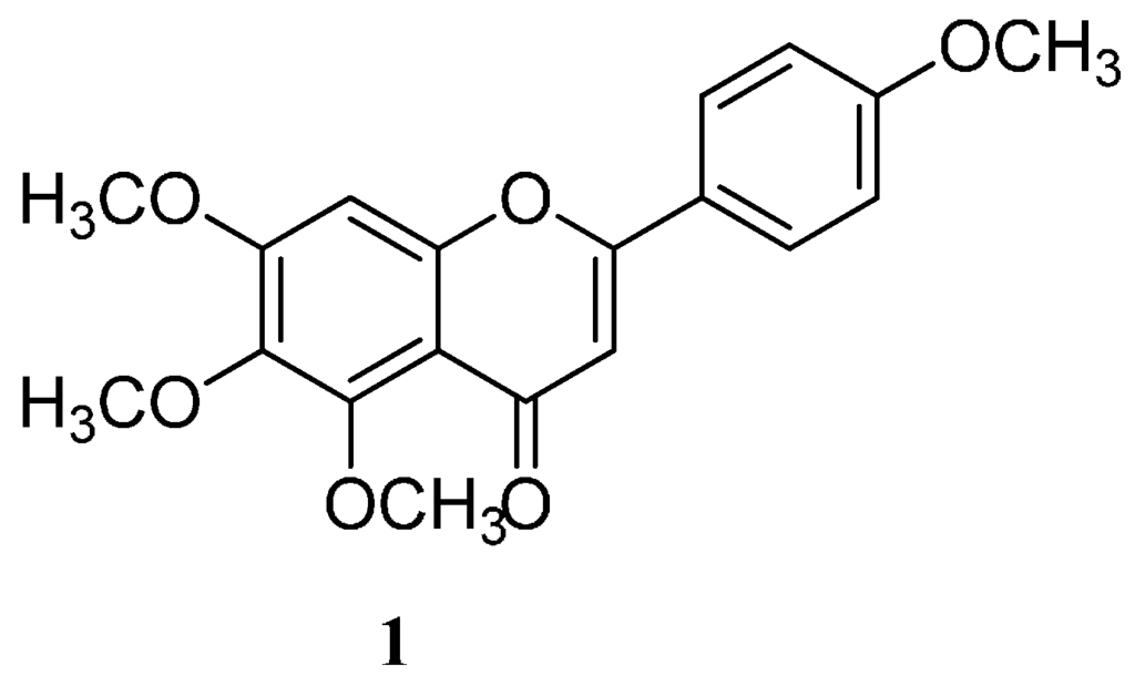 Flavonoids and other polyphenolic compounds are known to possess cytotoxic activities on different cancer cells and have other biomedical potentials [7,8]. However, water-insolubility and slow dissolution rate remains a serious drawback for their clinical applications [7,9]. Despite the plethora of evidence on PAMAM dendrimers to mediate medical application of most natural products, little have been reported on the encapsulation of flavonoids onto PAMAM and other encapsulating agents [9,10,11]. Thus, the essence of undertaking investigations involving PAMAM and a flavonoid 5,6,7-trimethoxy-2-(4-methoxyphenyl)-4H-chromen-4-one (Tetramethylscutellarein (TMScu, 1), (Figure 1)). The compound is known to exhibit anti-inflammatory properties [12] and moderate cytotoxic activity against human breast cancer cell lines (MCF-7) and anti-tuberculosis potency against Mycobacterium tuberculosis (H37Rv strain) [13], whereas its structural analogues are well acknowledged for treatment of various ailments [8,14]. Dendrimers effectiveness for encapsulation, solubolization and drug delivery depends on the number of generations and terminal group among other factors [3,4,5,6]. Hence, our investigations explored the capacity of the amine terminated PAMAM G4 dendrimer to encapsulate compound 1, a model compound among other bioactive flavonoids [13] for potential bioactivity enhancement. The compound solubilization under the influence of the synthesized G4 PAMAM dendrimer, in vitro release and stability in the dendrimer complex were studied, the results of which are reported in this paper.